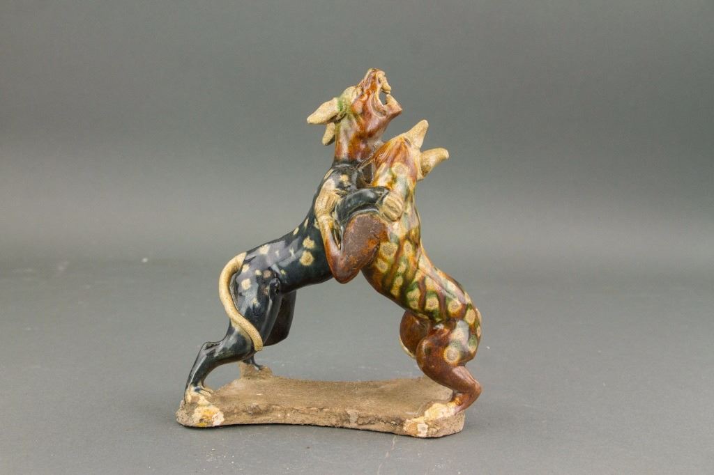 Chinese Tang pottery dogs figure; depicting the scene of two dogs have fighting; covered with sancai glaze; H: 21 cm, W: 15 cm, 462 grams
