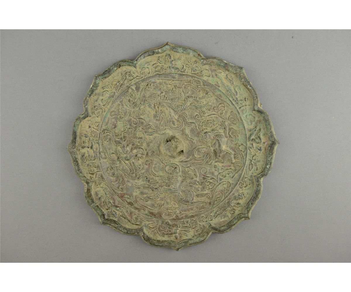 Chinese Tang-style eight-bracket lobed bronze mirror; featuring archaistic dragons in relief; D: 18 cm, 741 grams