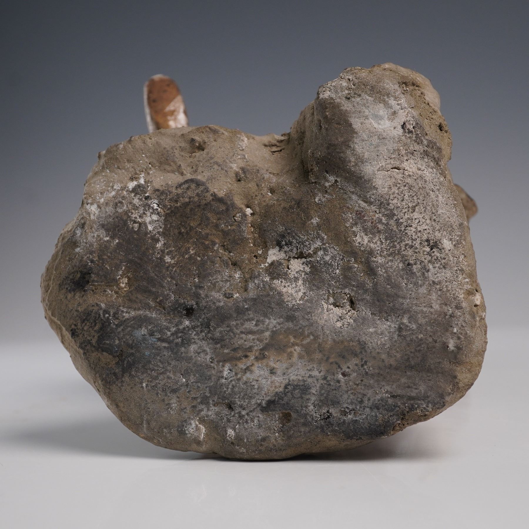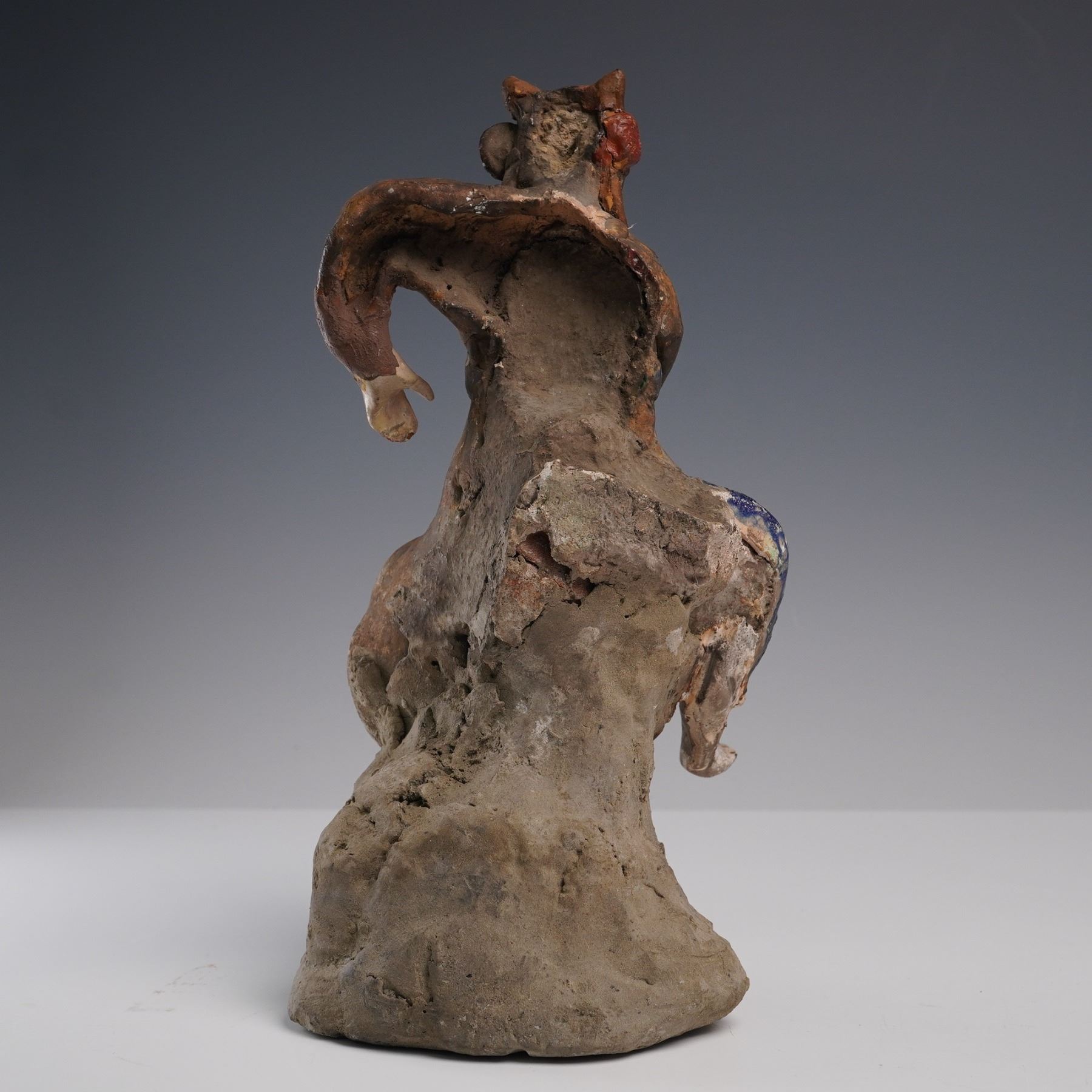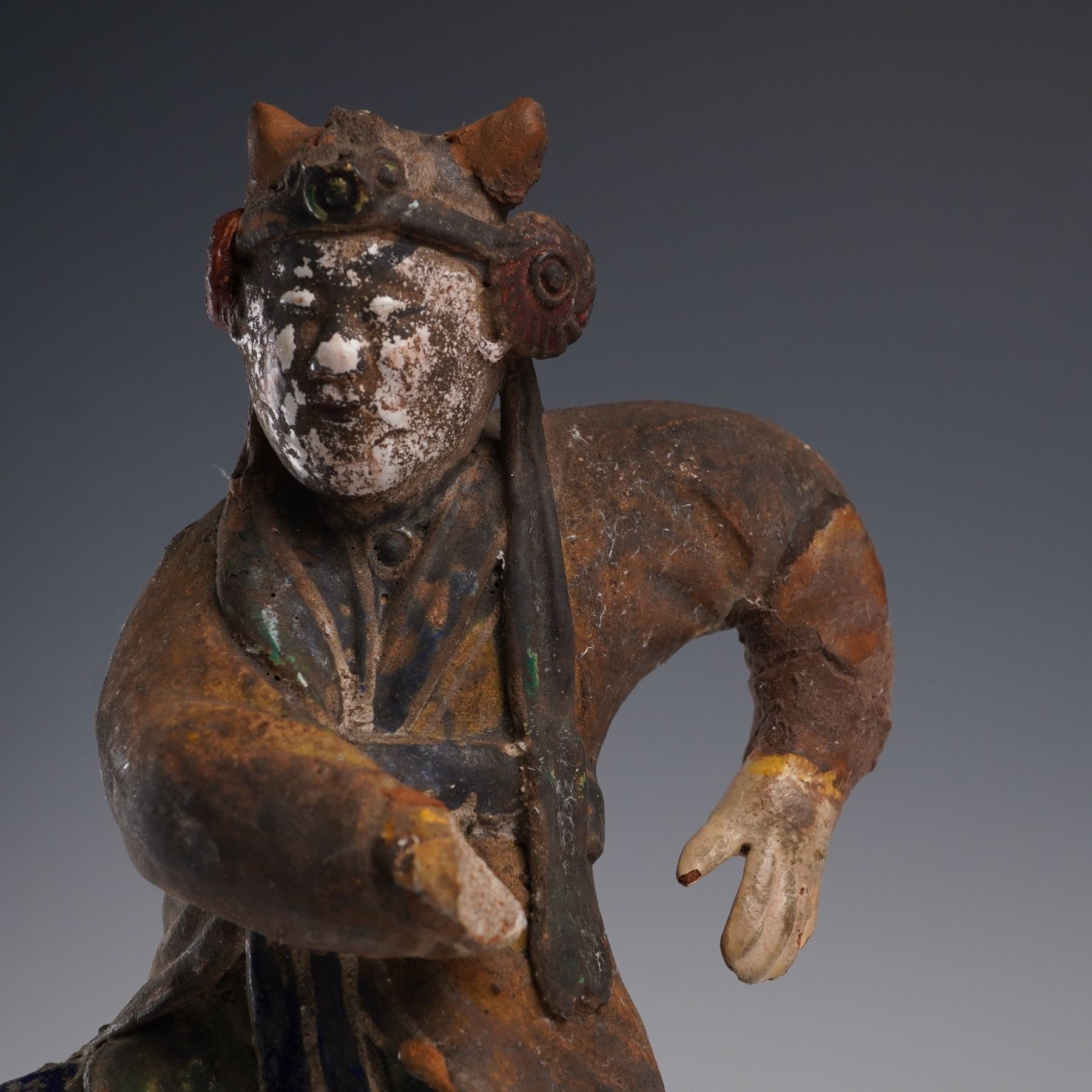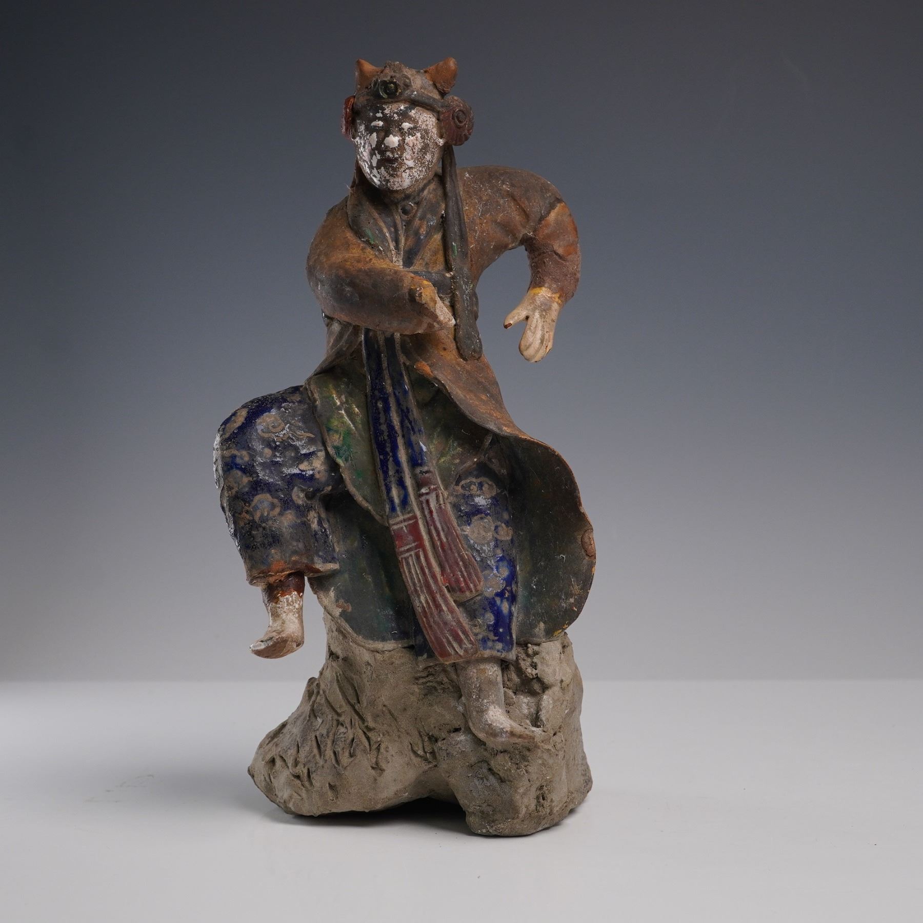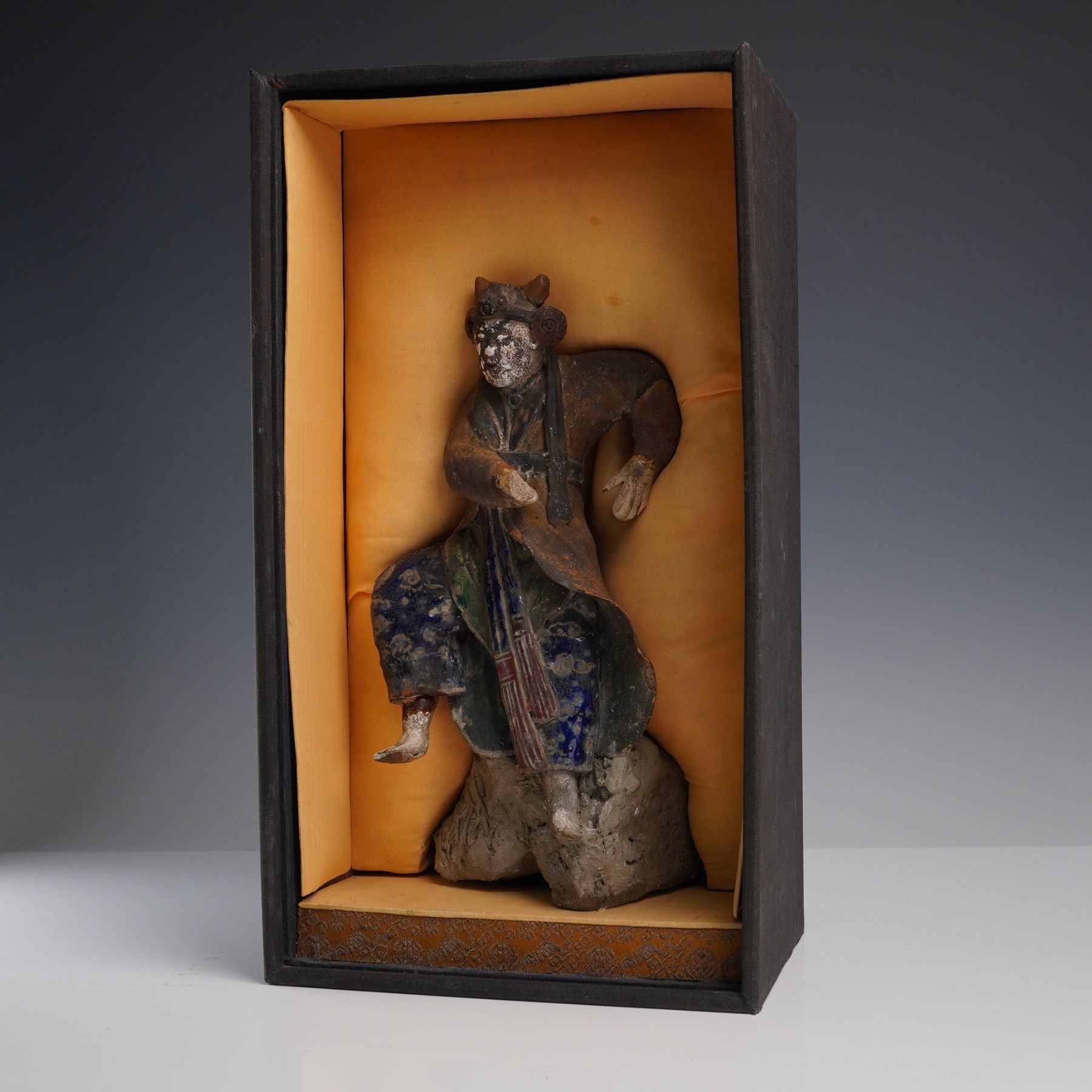 Earthenware warrior figure modeled in a dynamic stance with painted detail to the face, robes, and headgear. The figure is rendered in Tang dynasty style, with trace polychrome pigment and cobalt pigment retained in crevices. The surface shows heavy calcification, especially on the base, which has the character of excavated burial figures. Presented in a fitted presentation box with golden-orange silk interior. Measures 9.25"H. Box measures 7"L x 13"H.