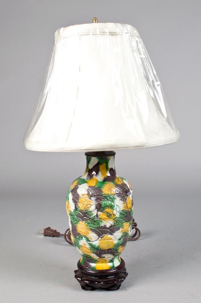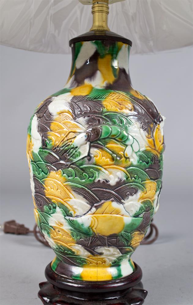 Vase form column with raised flying fish, hogs, birds and other species amid ruyi in yellow, green, lavender and white. Attached to custom carved wood standard with ivory colored shade. 18" overall height. Circa 20th century.