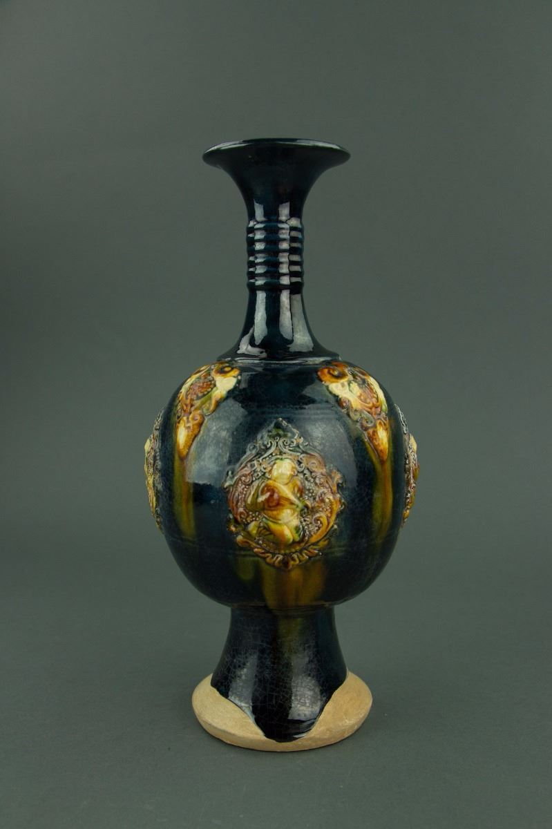 Chinese Tang style Sancai porcelain vase; of ovoid body raised on a splayed foot and connecting to a waisted ribbed neck; decorated with figures playing musical instruments in low relief; all reserved on a black-glazed ground; H: 30 cm, W: 9.5 cm, 884 grams