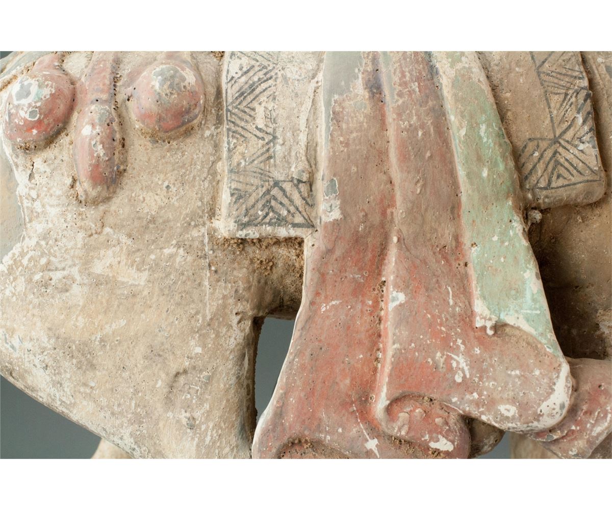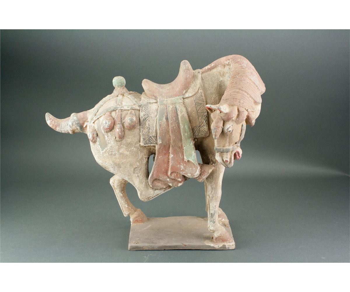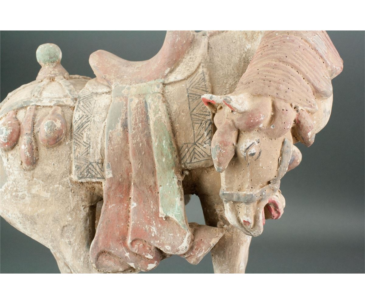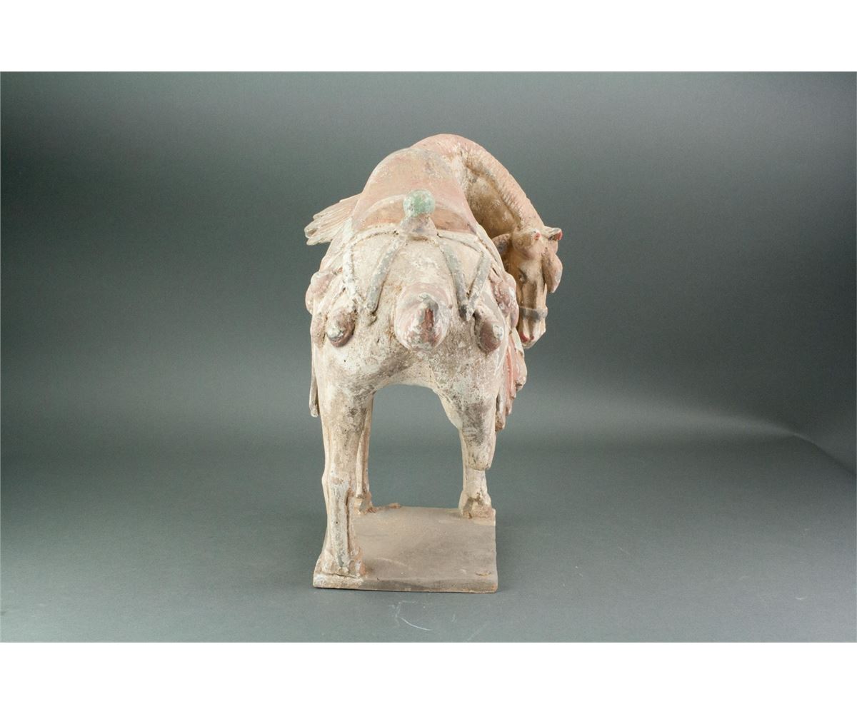 Chinese Tang style pottery horse; featuring horse scratching its head with its hoof; with green and red paint on body; H: 39 cm, W: 40 cm, 4000 grams