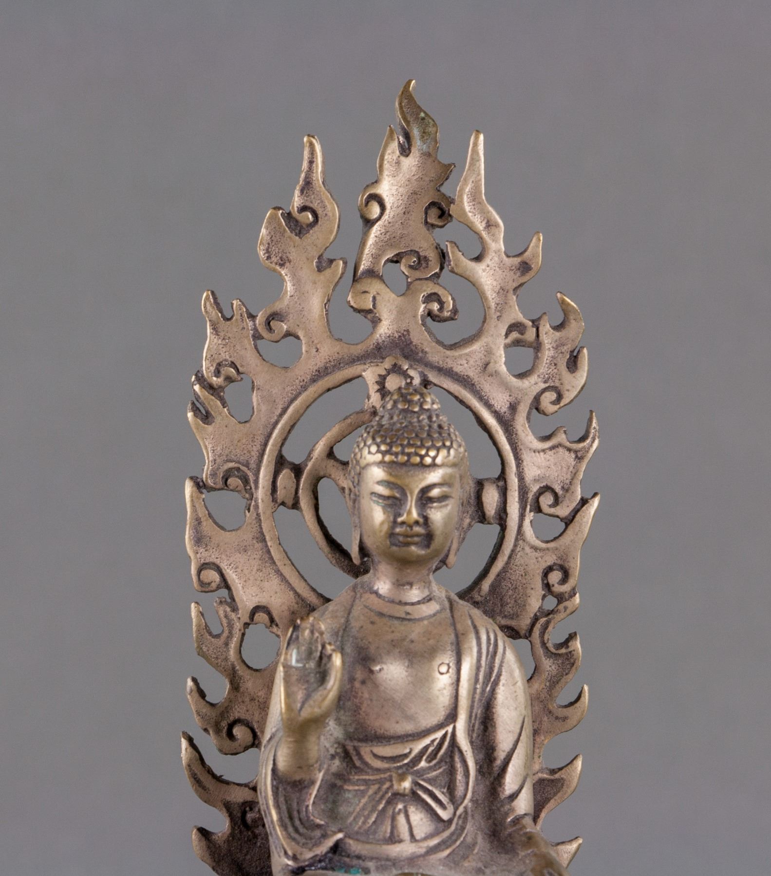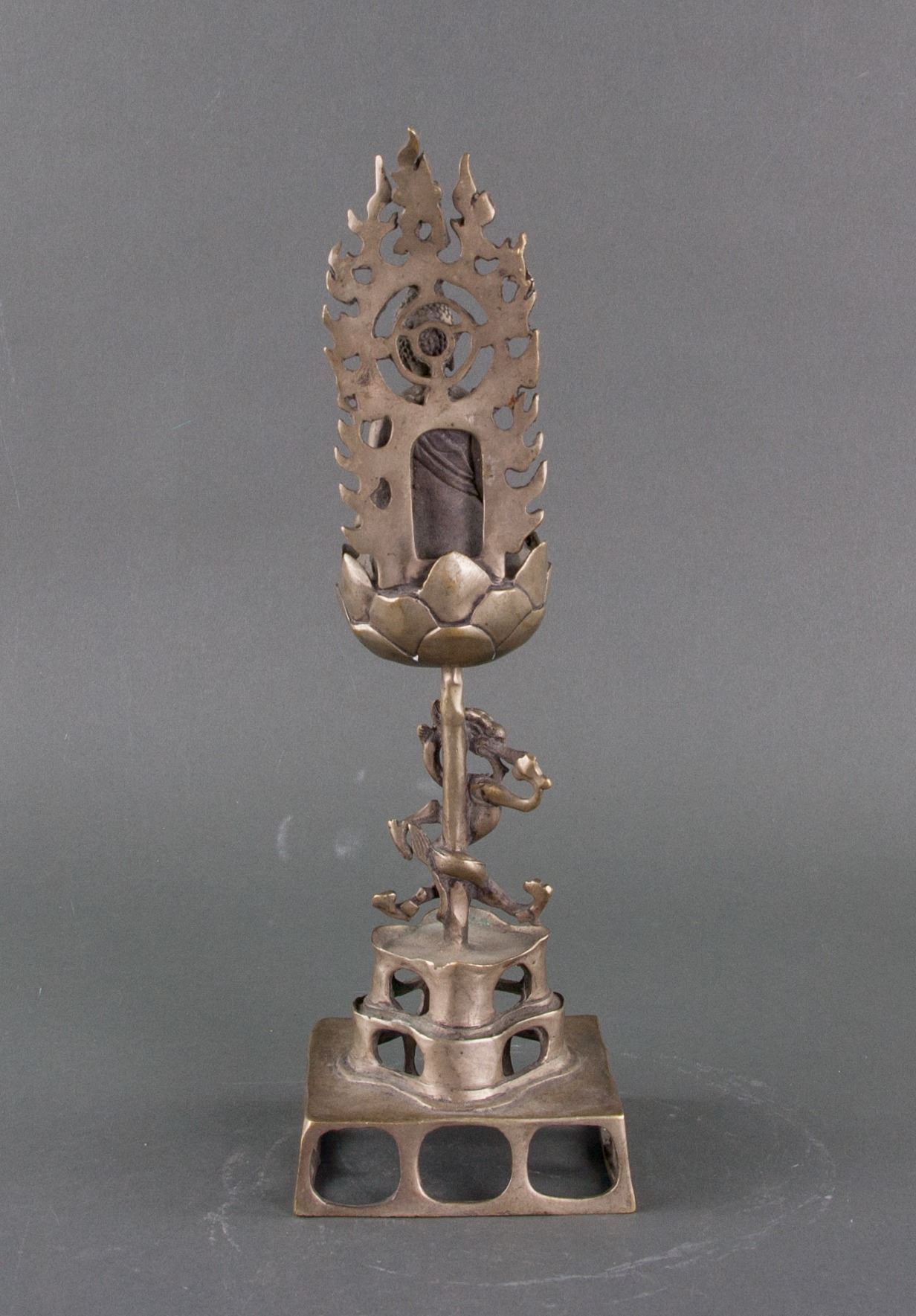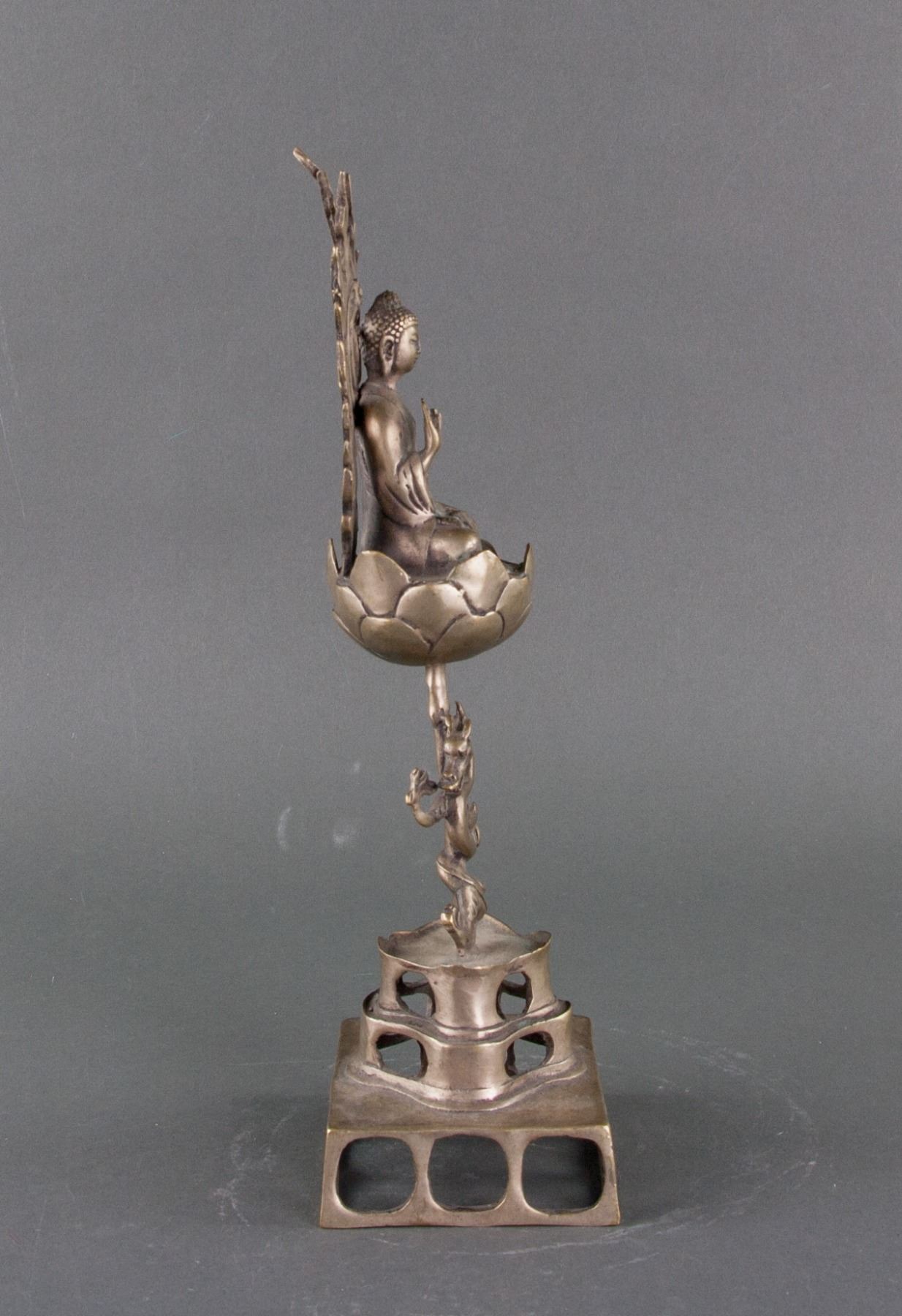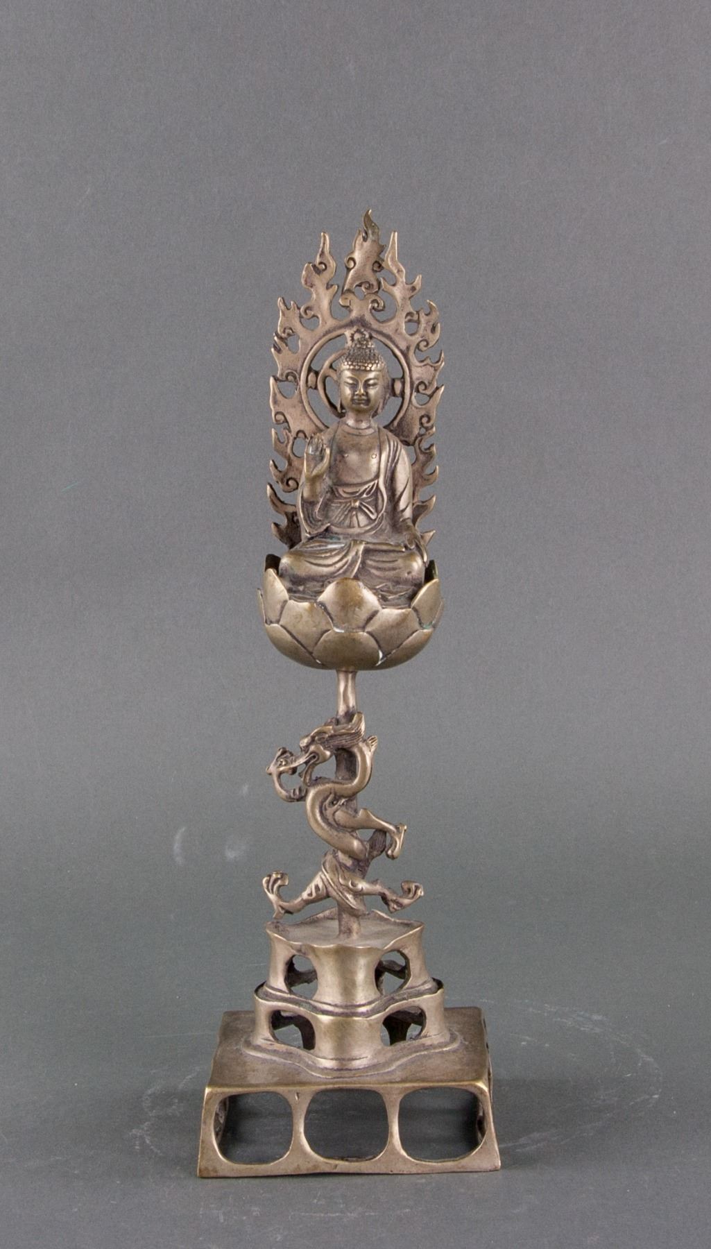 Chines Tang style silver statue; depicting Shakyamuni Buddha sitting on the lotus pedal base with flame aurora; supported on a stupa form base surround by a dragon; 32 cm x 9.5 cm, 863 grams