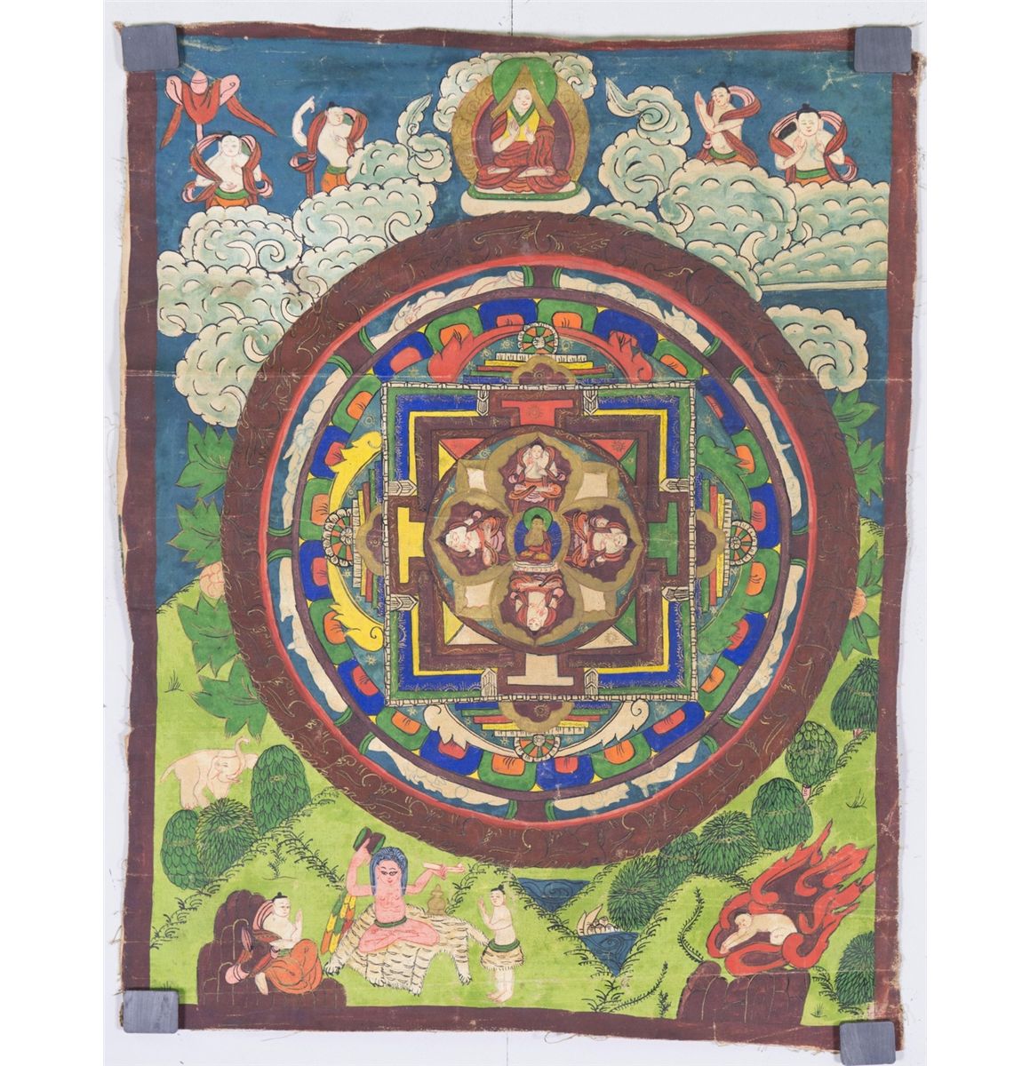 Chinese Tanka painting on textile; featuring Buddha sitting in a court with a square outer section and a circular inner section; with one red seal on back; 36 cm x 47 cm