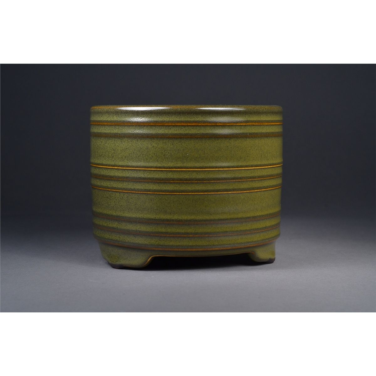 Chinese tea dust glazed porcelain censer; cylindrical body featuring ridged design, supported on tripod trefoil-shaped feet; six-character Yongzheng Mark; H: 11 cm, D: 13 cm