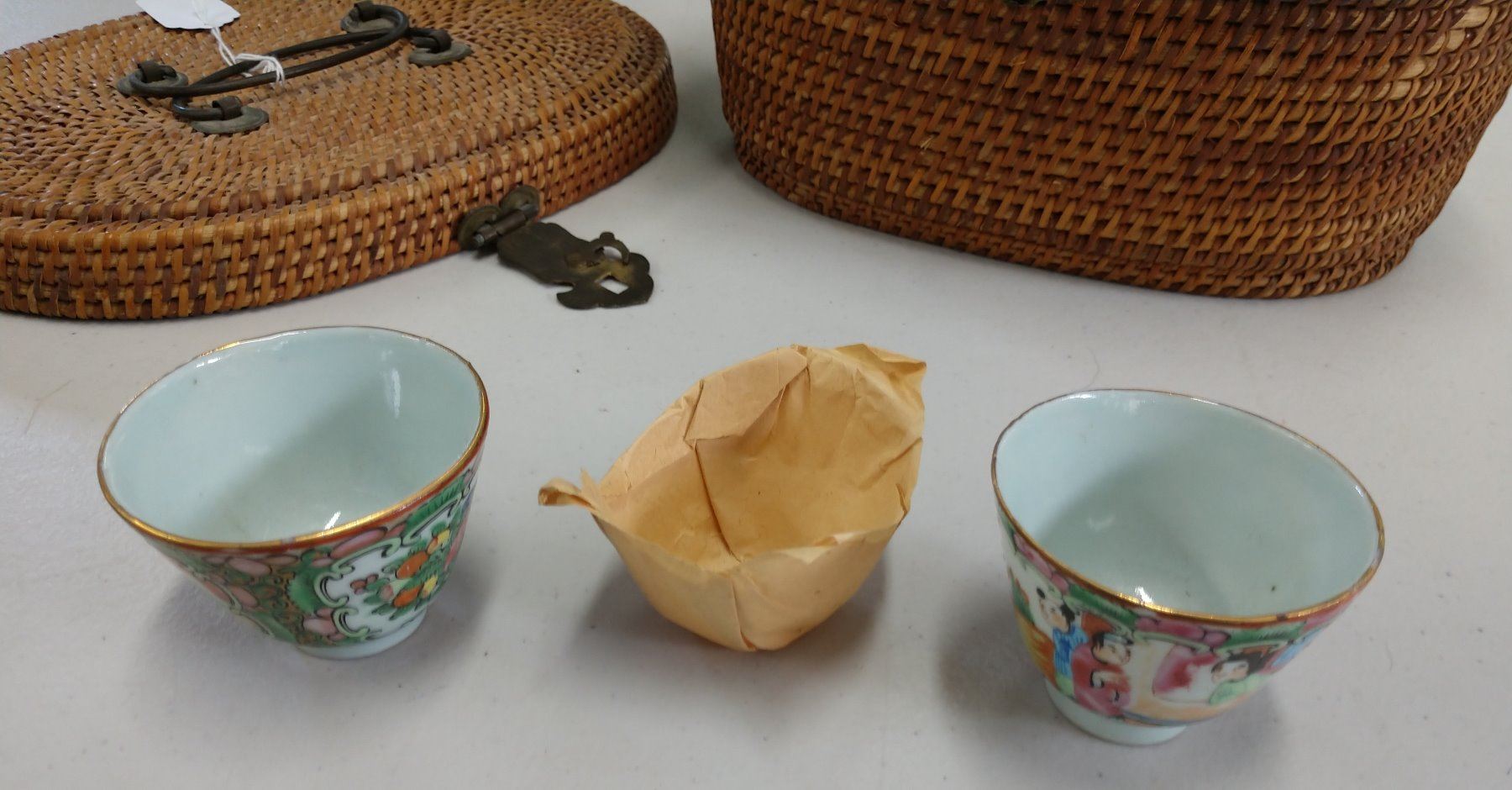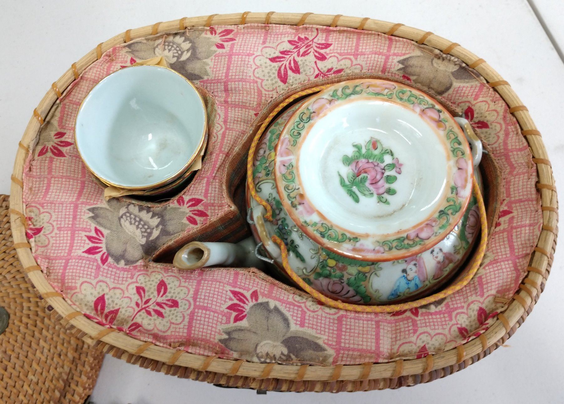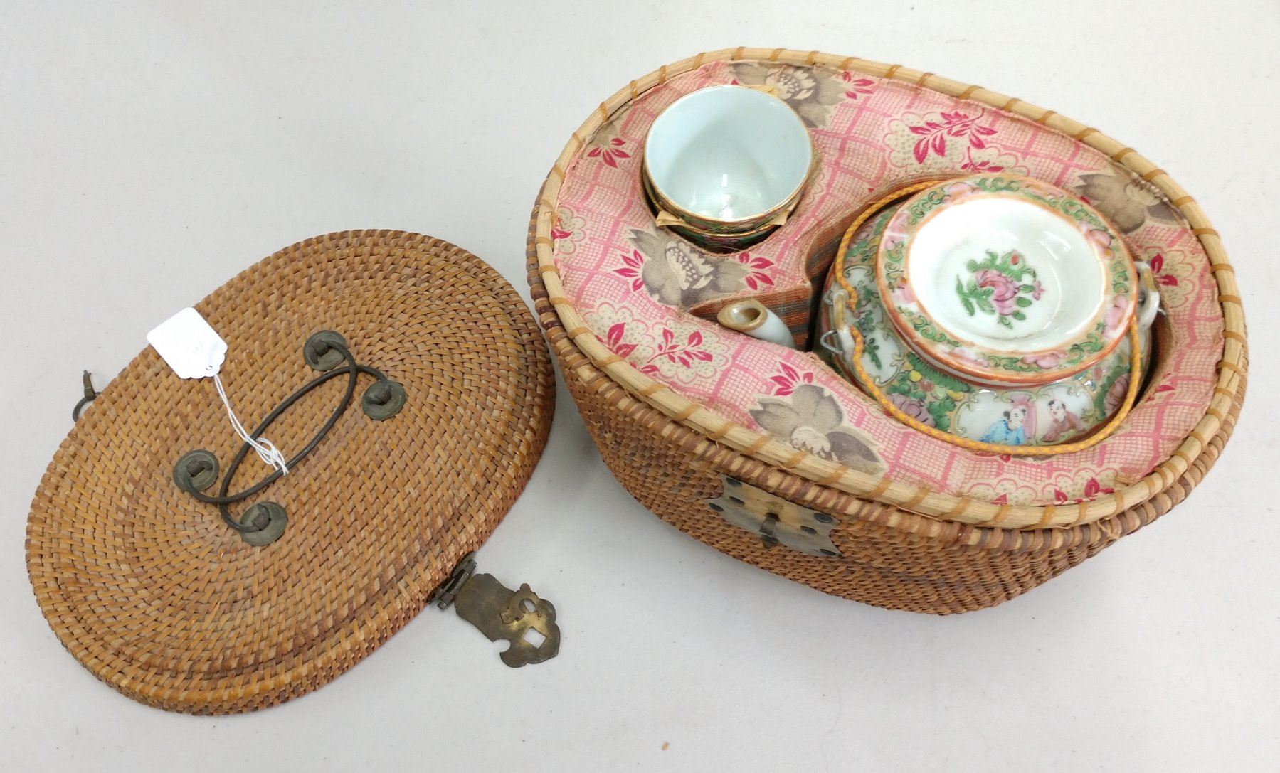 Chinese Tea Pot, early 20th century item. Made of ceramic and paint with fiber basket, the basket measures 10" x 8" x 7". China. Has tea pot and lid, 2 cups, and carrying case. Condition: Worn, some damage to case, see images. Shipping: $30.00 w/insurance and signature, due to size and weight.