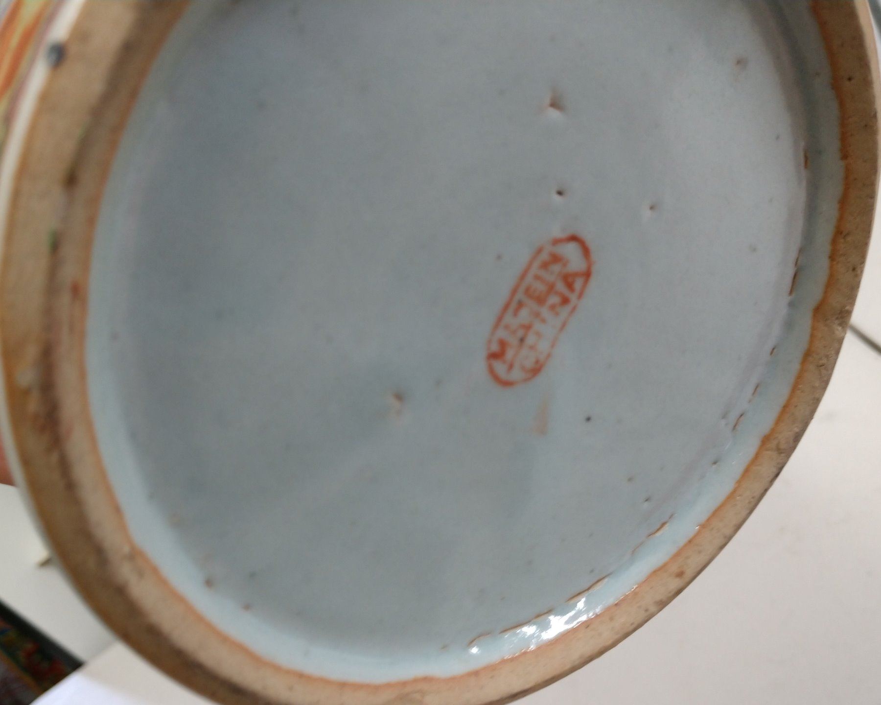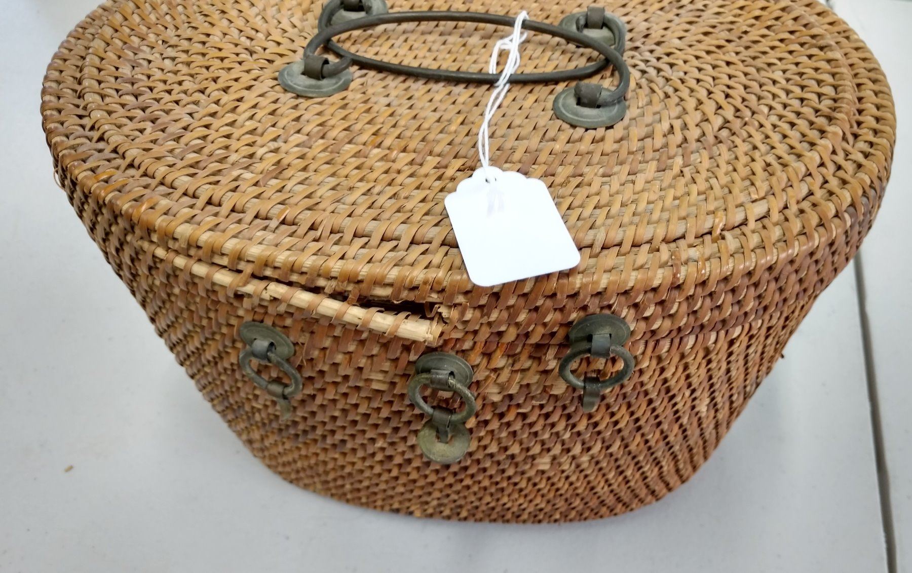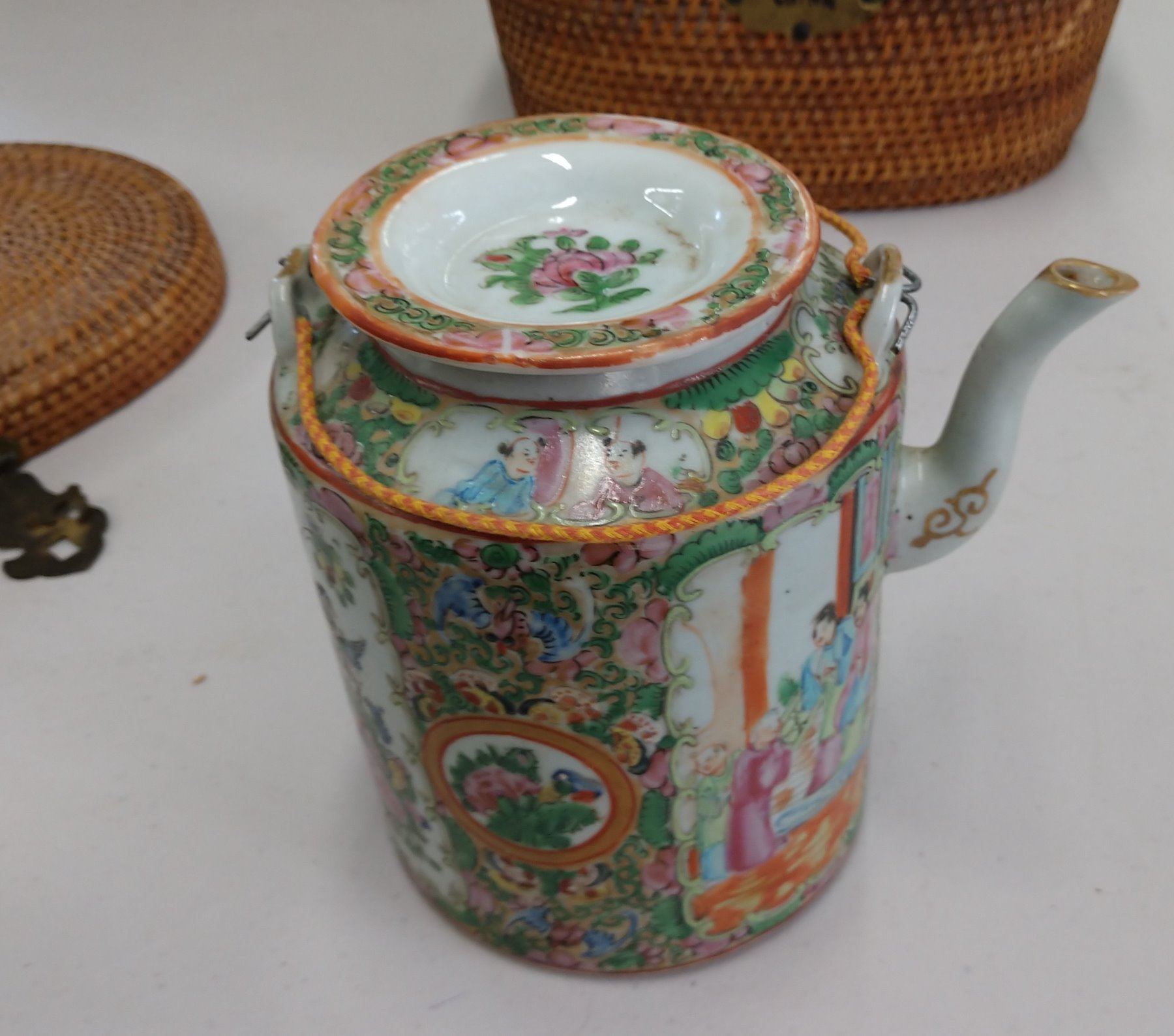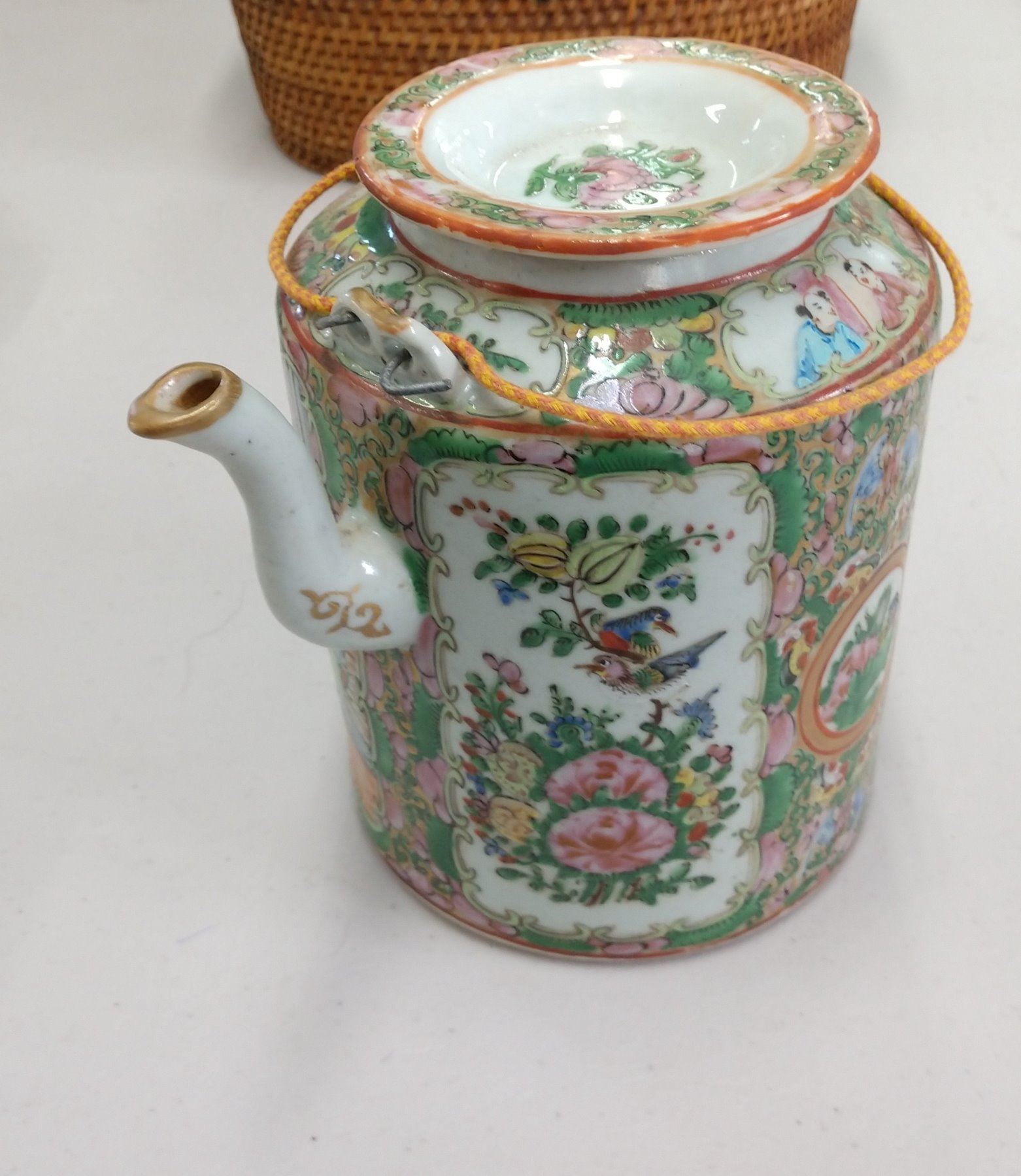 Chinese Tea Pot, early 20th century item. Made of ceramic and paint with fiber basket, the basket measures 10" x 8" x 7". China. Has tea pot and lid, 2 cups, and carrying case. Condition: Worn, some damage to case, see images. Shipping: $30.00 w/insurance and signature, due to size and weight.
