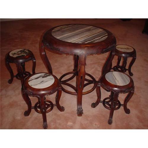 This is an unique five piece Mahogany table from the early 1900's. The set consist of a round table with four stools of marble on each top in the same style exactly. This is a fine quality built set with flame grainings and details. The table dimensions: Diameter 32 inches and Hight 32 inches. The stool dimensions: Diameter 14 inches and Hight 18 inches.