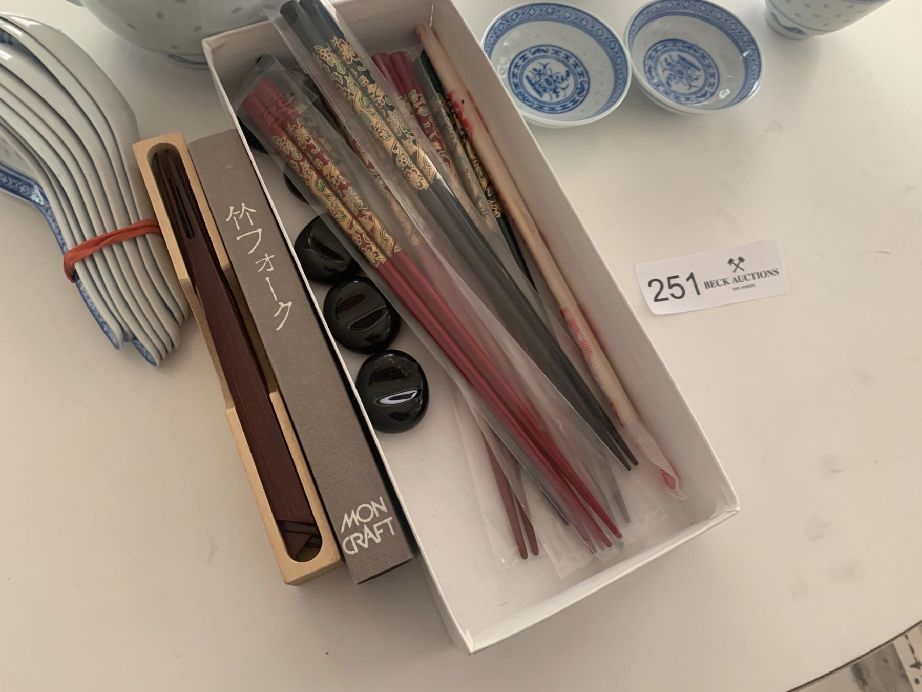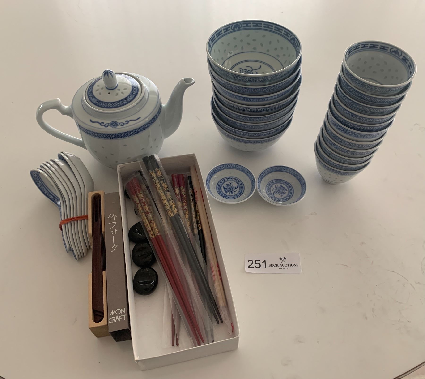 11 x teacups, 8 x soup bowls, 1 x teapot, 8 x wonton soup spoons, 7.5 x chopstick pairs, 2 x sauce dishes, & more!