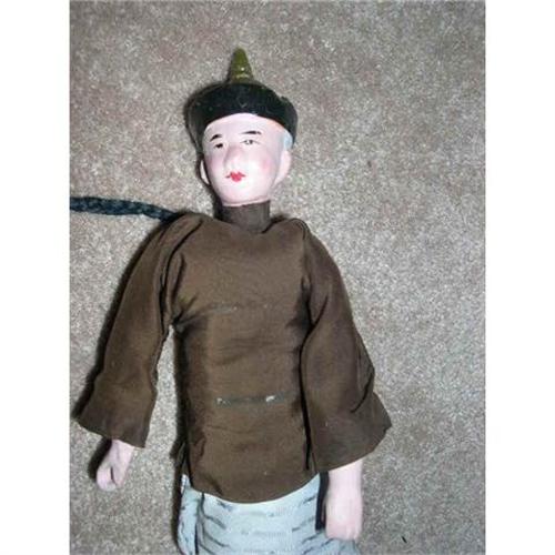 This is a character doll made in China. It was brought back to the U.S. during a visit to Chinese School. This man is to be the Chinese teacher. He has the tail hanging in the back. The molded hat has some paint missing on the edges of the brim. There is a line across the stomach area where maybe the stand was. There is some black paint chipped off the boots. There is a wire through the feet as a stand. I don't think it provides much support. His faceis hand painted. Hand are not chipped. Buyer to pay $12 for U.S. shipping, insurance, and handling. He is from a smoke free environment. If you can love him, please bid. Thanks for viewing.