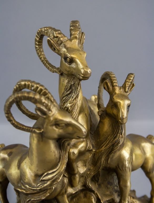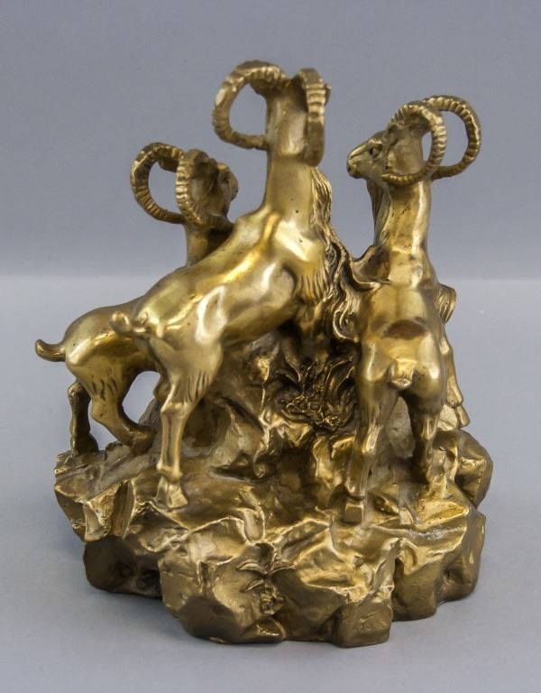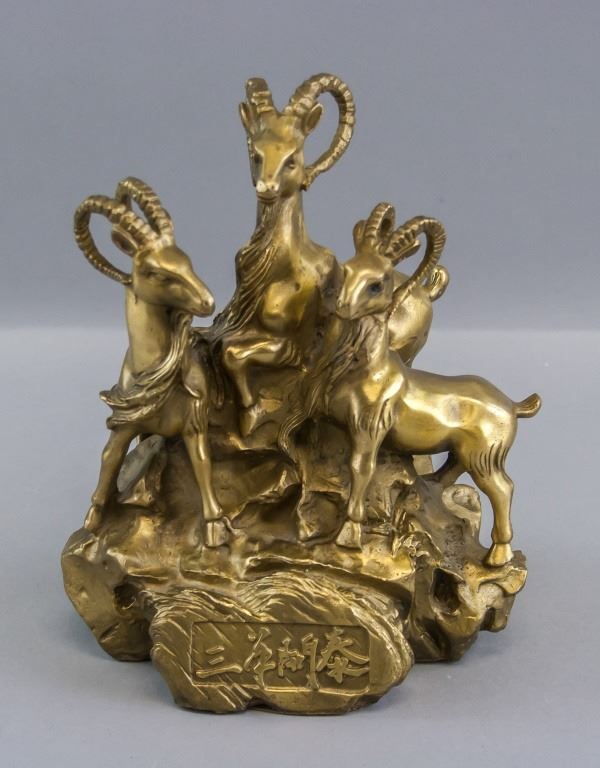 Chinese gilt bronze statue. Featuring three goats. 23 x 16 cm. 1,621 grams.
