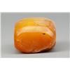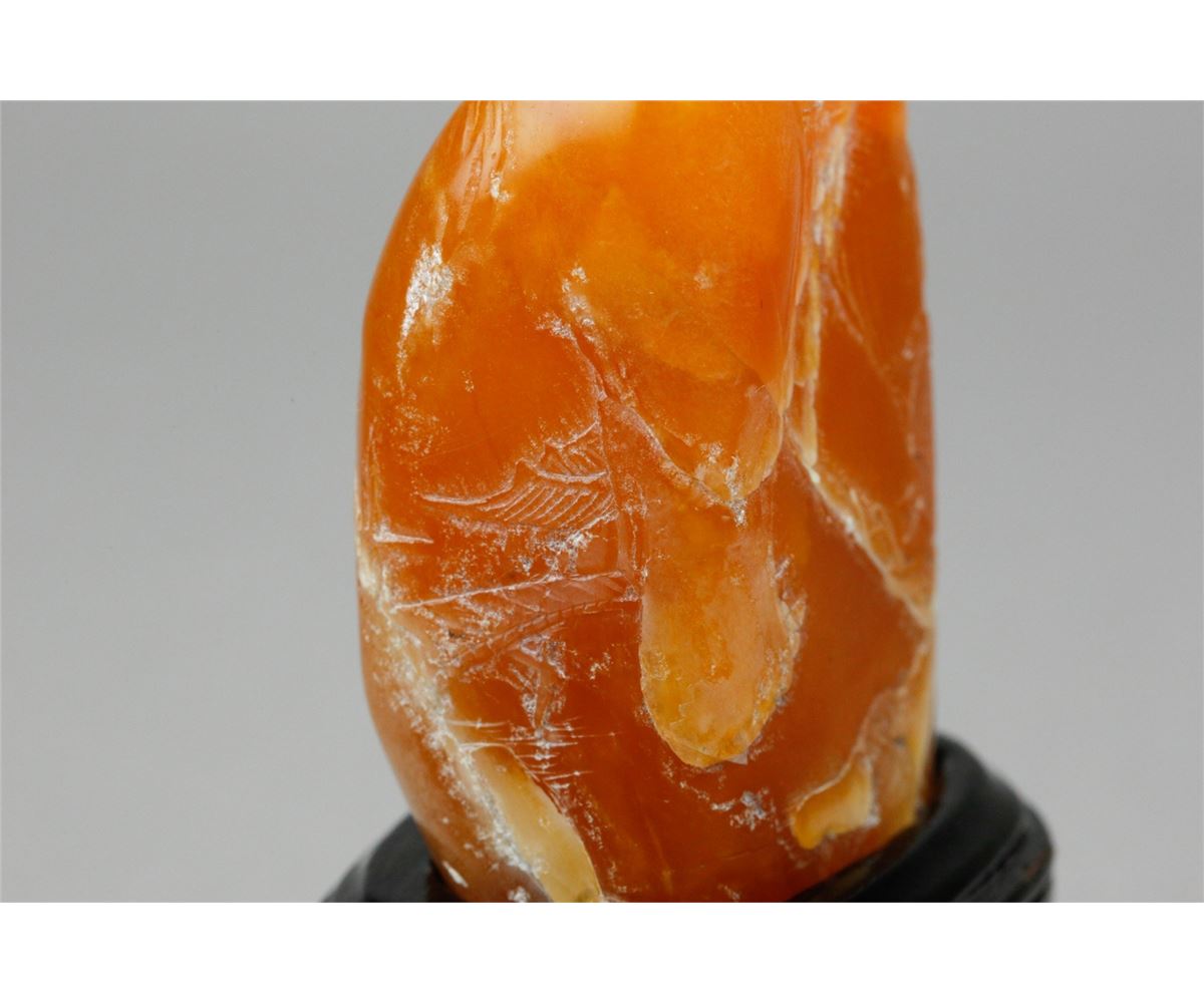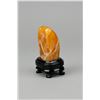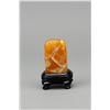 Chinese Tianhuang stone boulder; featuring village and mountain scene on body; of various yellow tone; custom wood stand included; H: 7 cm, W: 4 cm, 142 grams