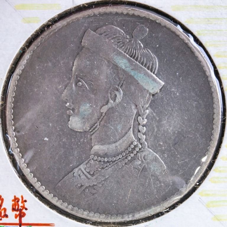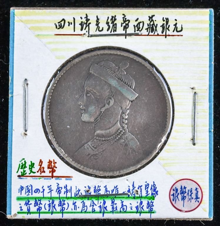 Chinese coin. Obverse: Bust of Guangxu facing left wearing cap and floral garmet. Reverse: Four Chinese ideograms read top to bottom, right to left with flower in the centre, all surrounded by floral wreath. Lettering (Chinese romanized): SI CHUAN SHENG ZAO. Diameter: 4 cm. 14 grams with case.
