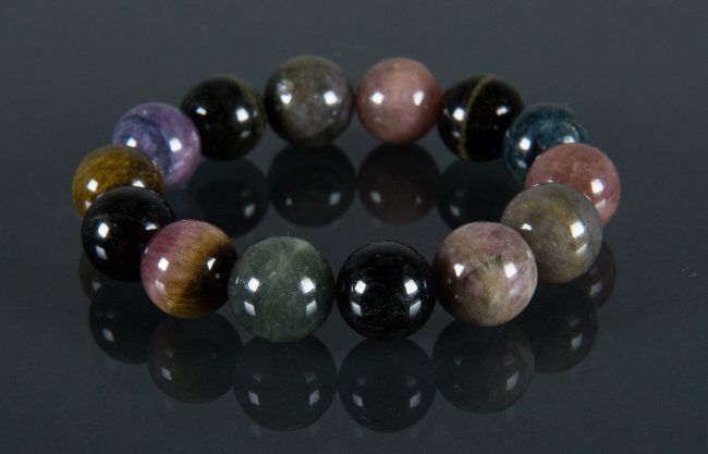 Chinese tourmaline carved bracelet; D: 7 cm, Beads D: 1 cm, 60 grams