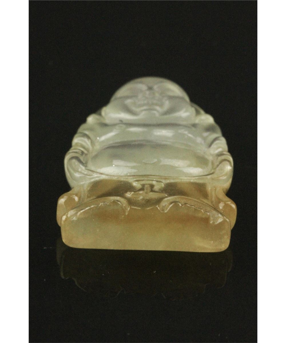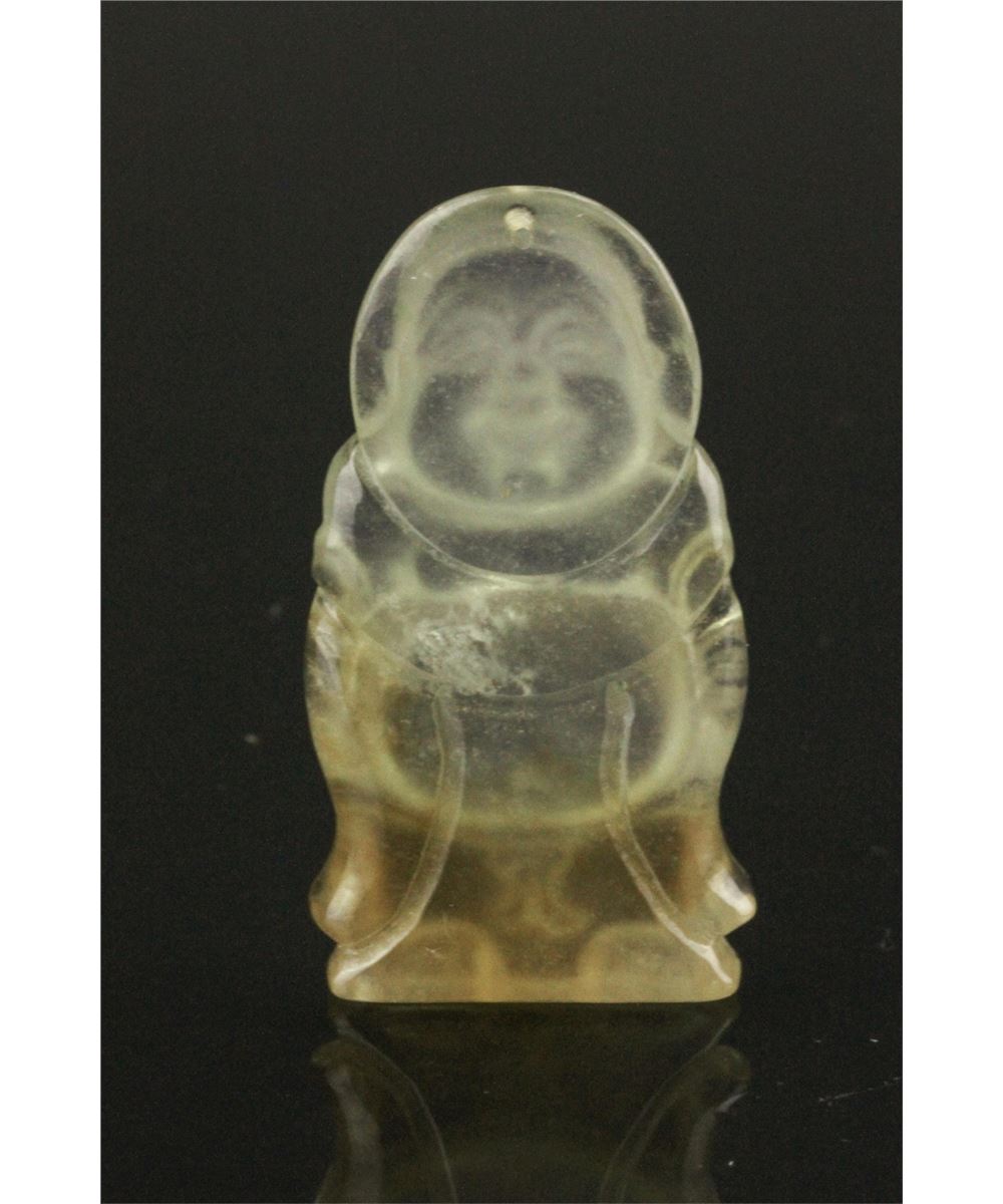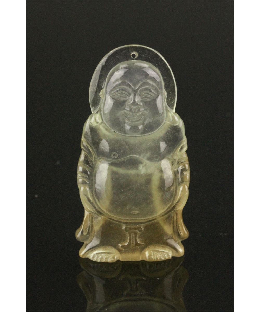Fine Chinese icy jadeite carved pendant, featuring standing laughing Buddha with halo. The stone of transparent white and brown. H: 4.1 cm, W: 2.2 cm, 20 grams.