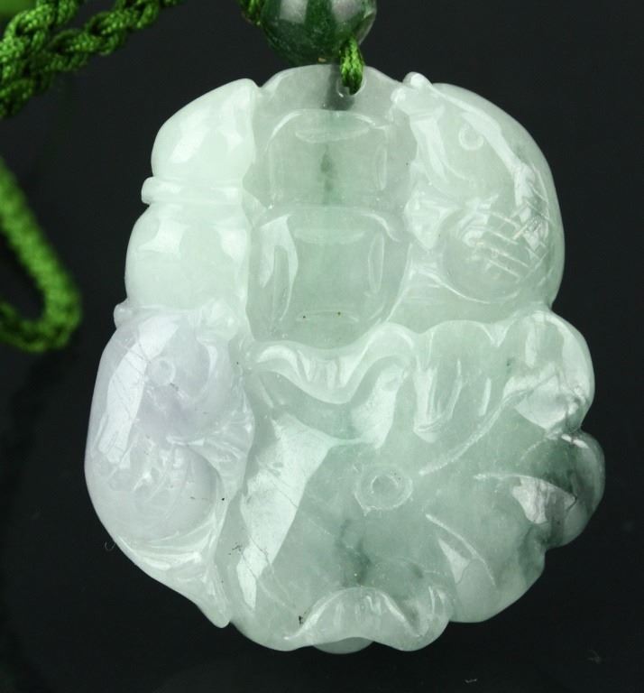 Chinese jadeite carved pendant; featuring double carps on lotus leaf; of lavender tone with apple green and spinach green suffusions; suspending on a green string; H: 6 cm, W: 5 cm, 82 grams; Density: 3.27