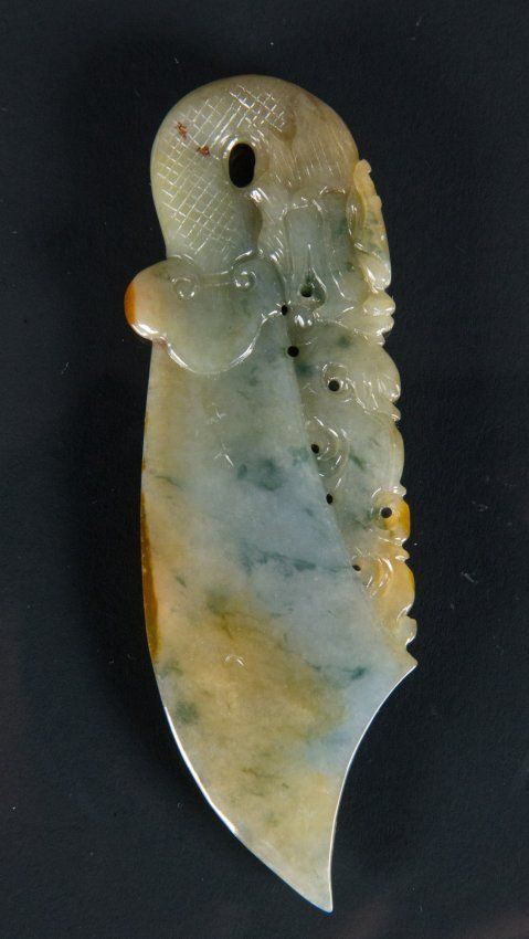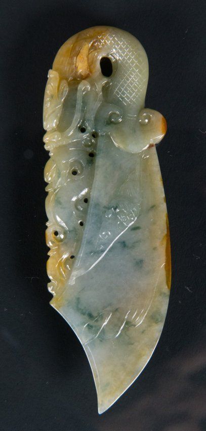 Chinese jadeite carved pendant; of guan form featuring tri-colour translucent tone; H: 9.9 cm, W: 3 cm, 30 grams