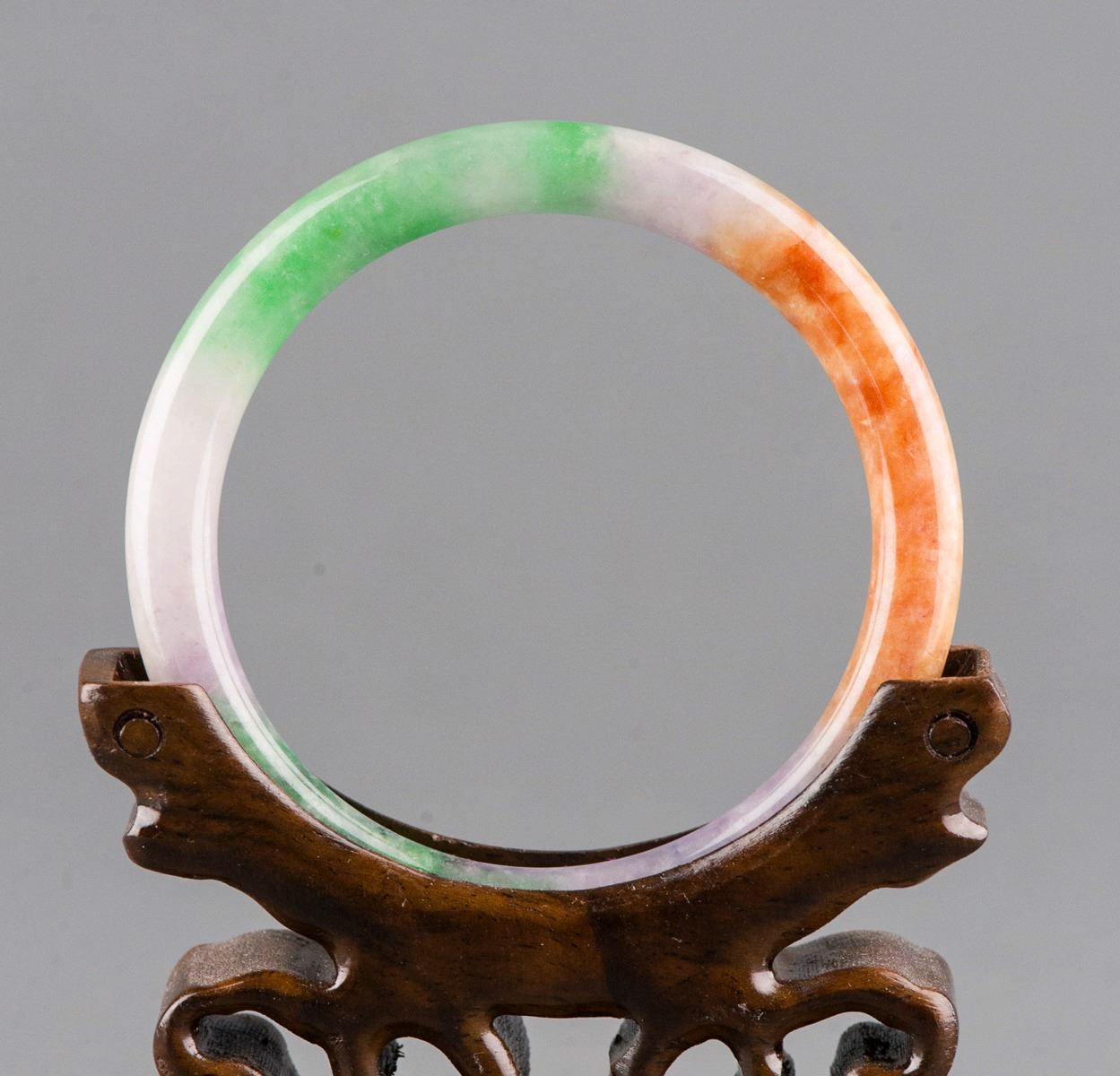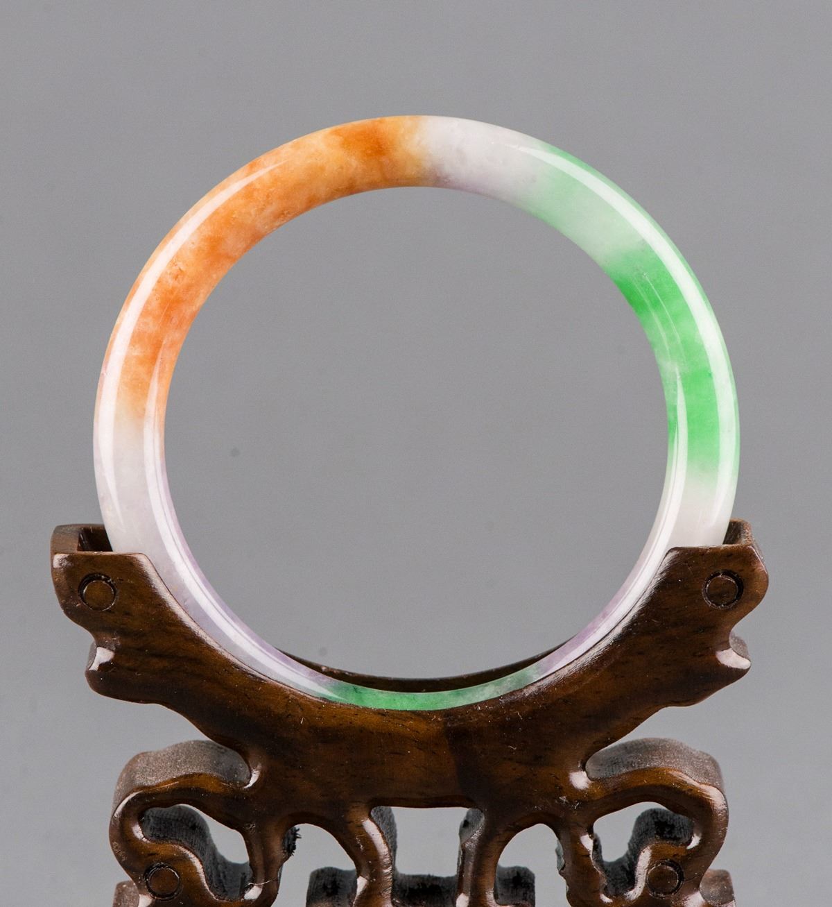 Chinese tri-tone jadeite bangle, unique stone of lavender, orange and emerald green tone. Rounded edge. Wood stand not included. D: 7 cm, inner D: 5.5 cm, 29 grams.