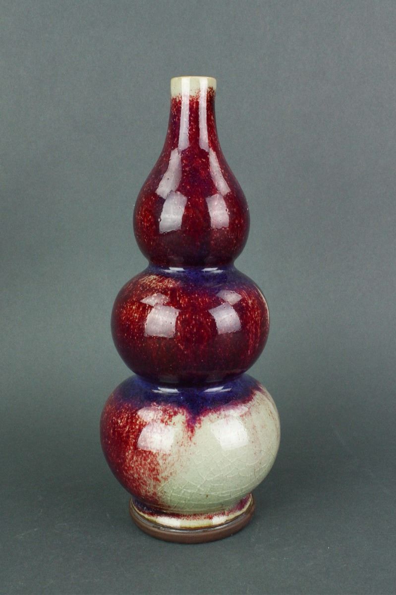 Chinese triple-gourd porcelain vase; covered in flambe purplish-red glaze thinning to mushroom around mouthrim; the lowest bulb applied with mushroom-grey wash; H: 25 cm, D: 11 cm, 643 grams