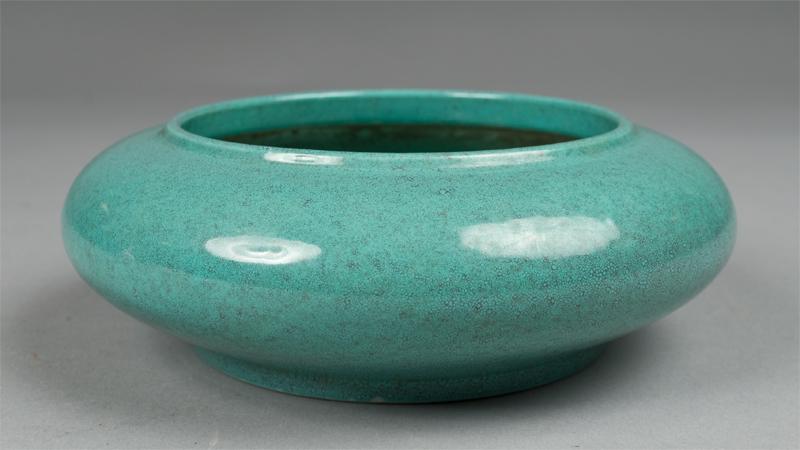 Of compressed form, the body covered in a rich turquoise glaze, the base with recessed seal mark for Great Qing Qianlong Production. 2.5" H x 7.25" W, circa 20th century.