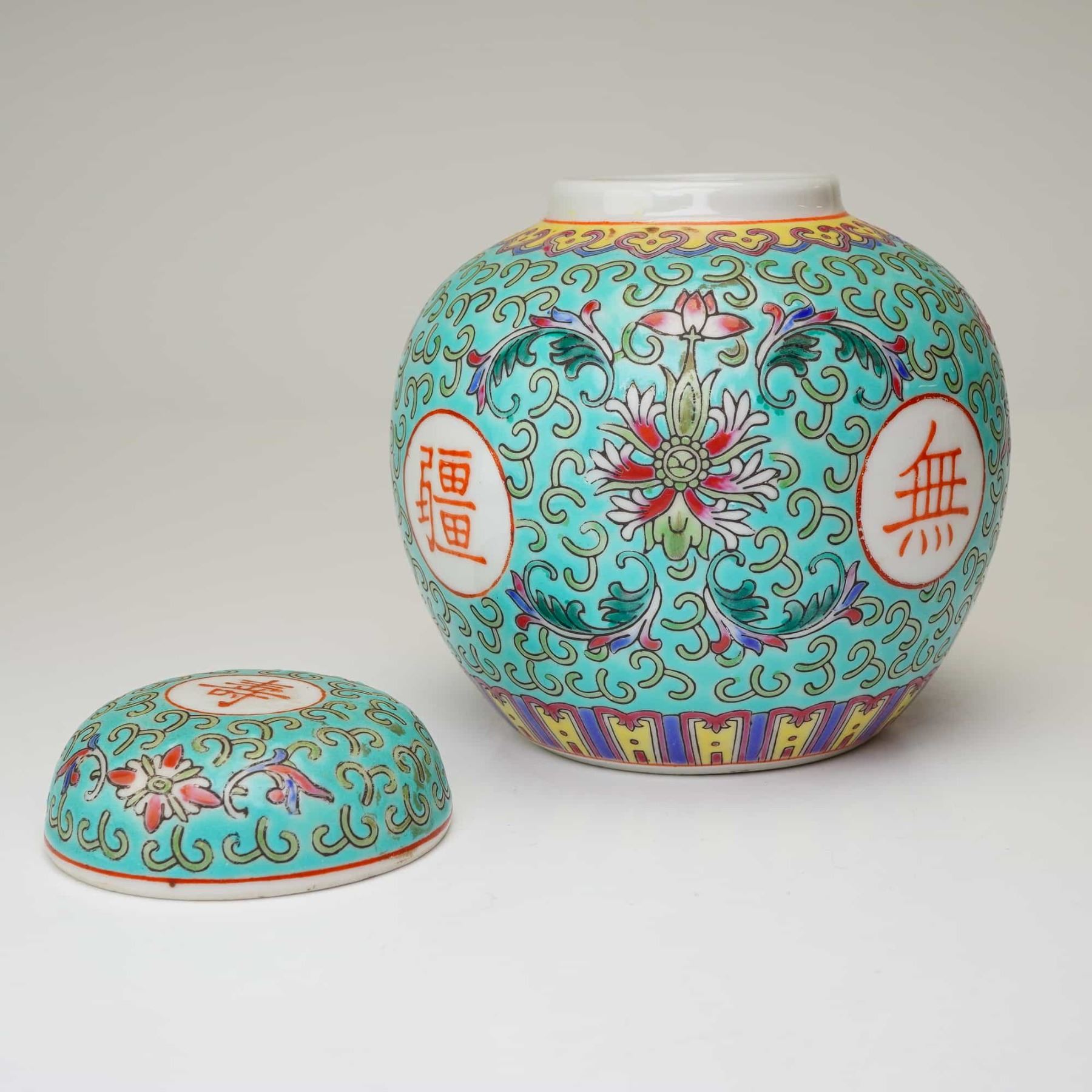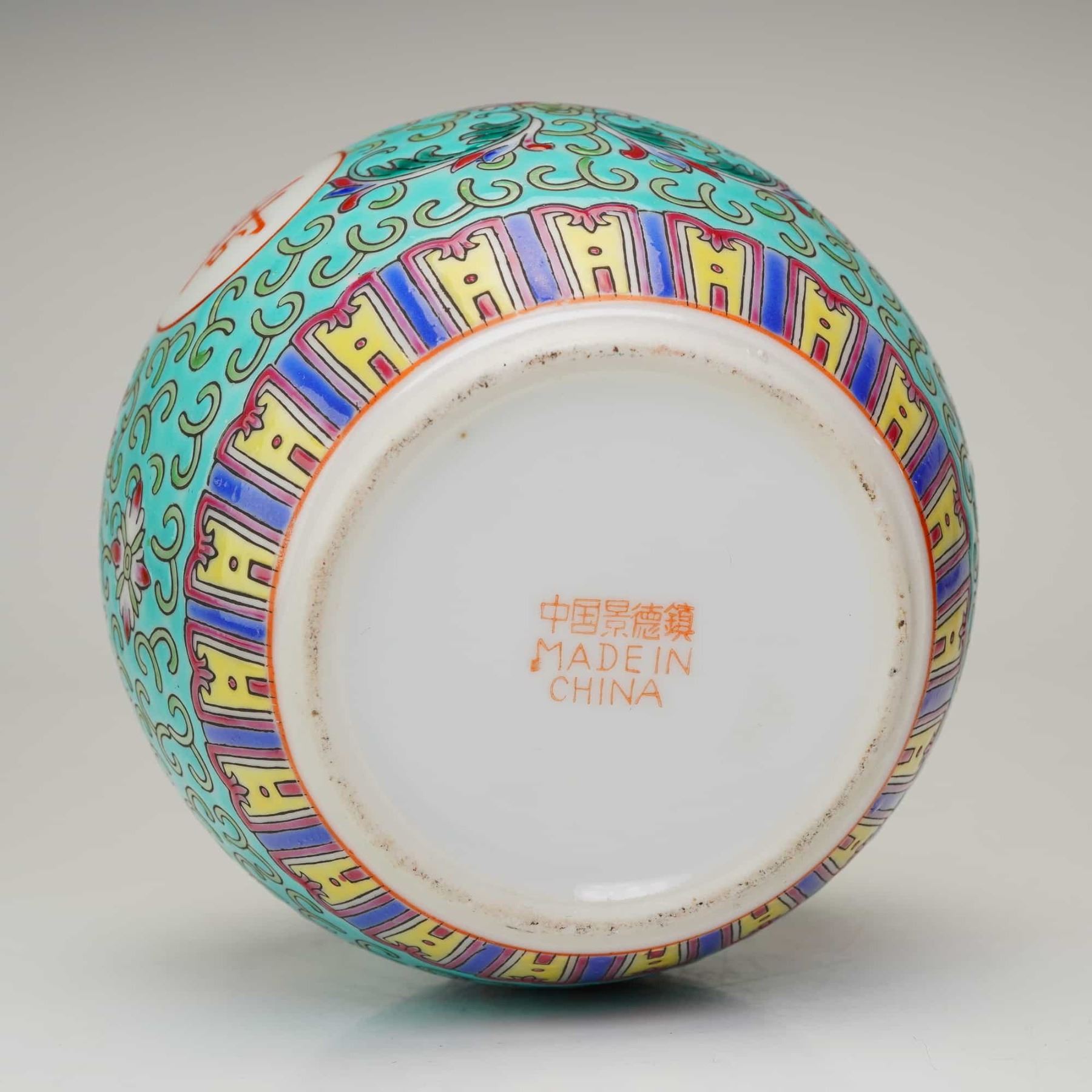 The exterior features a vibrant turquoise ground embellished with a pattern of scrolling tendrils. Four circular medallions contain iron-red characters. These medallions are interspersed with stylized lotus blossoms and scrolling foliage. The shoulder is encircled by a band of multi-colored ruyi heads, while the base is finished with a stylized petal lappet border. The matching domed lid follows the same decorative scheme. The base bears a four-line iron-red stamped mark: Made In China.