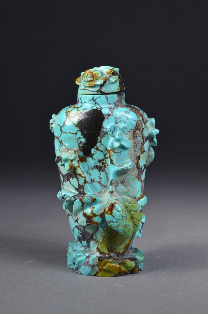 Chinese carved turquoise snuff bottle; in naturalized form with branches and vines; supported on flat foot rim; H: 8 .5 cm