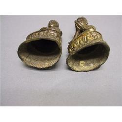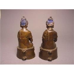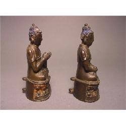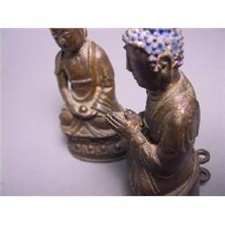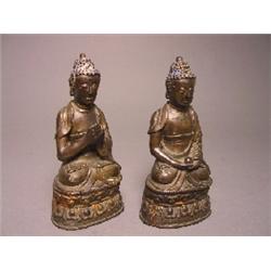 Two bronze buddha figures each seated on a double lotus pedestal with one holding his hands together in prayer and the other with his hands on his lap holding a ball. Good condition with traces of the original gilt lacquer. China, Early Ching Dynasty. 6 1/4" (16 cm) H.