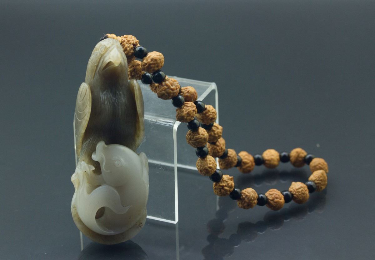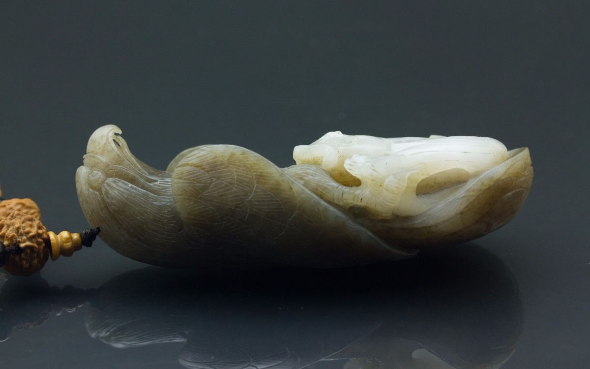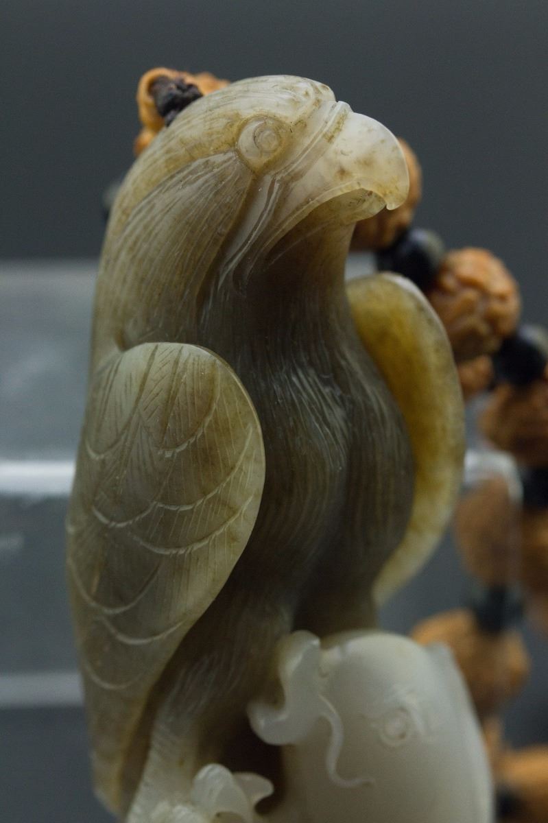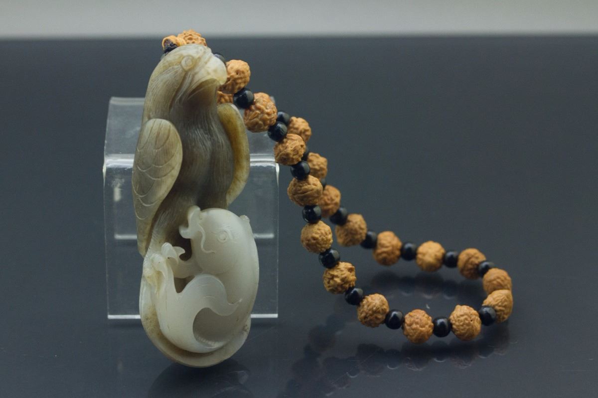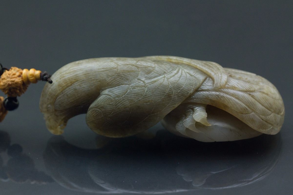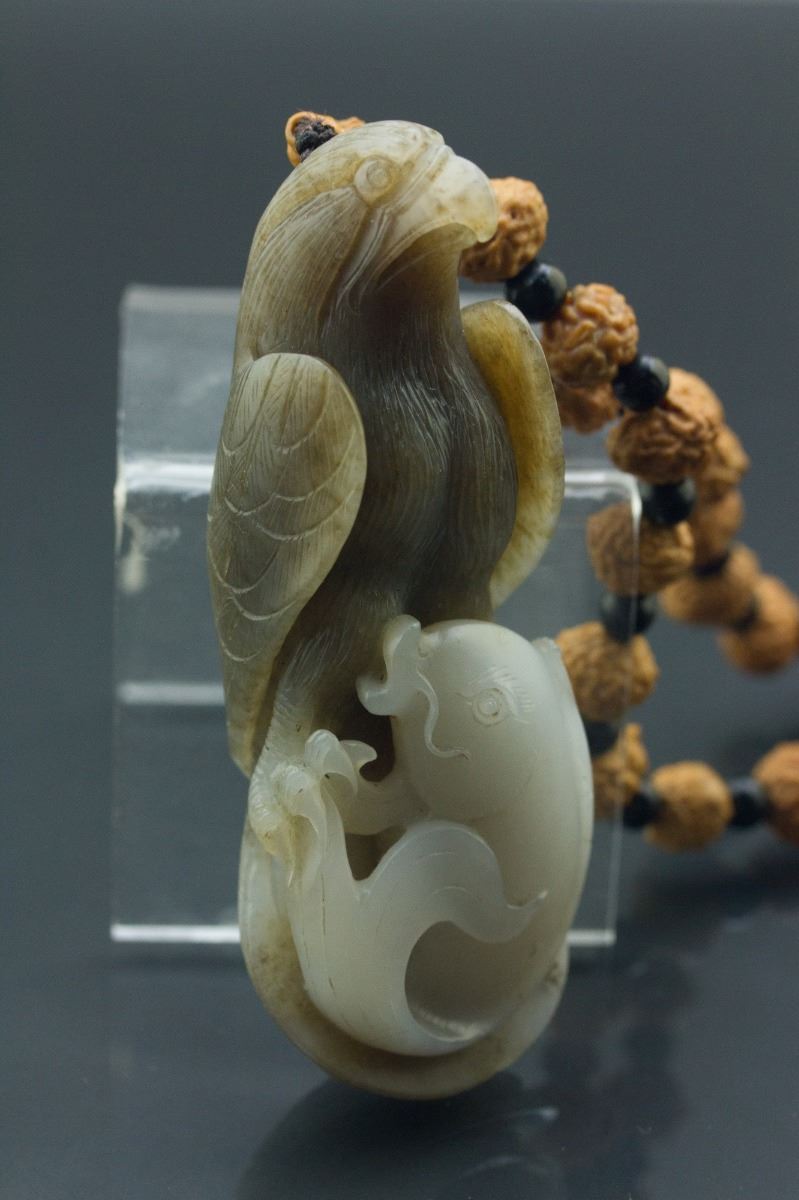 Chinese jade carved pendant; depicting an eagle grasping a carp; of white and russet tone; suspending on a nut-bead cord; H: 10 cm, W: 4 cm, 141 grams