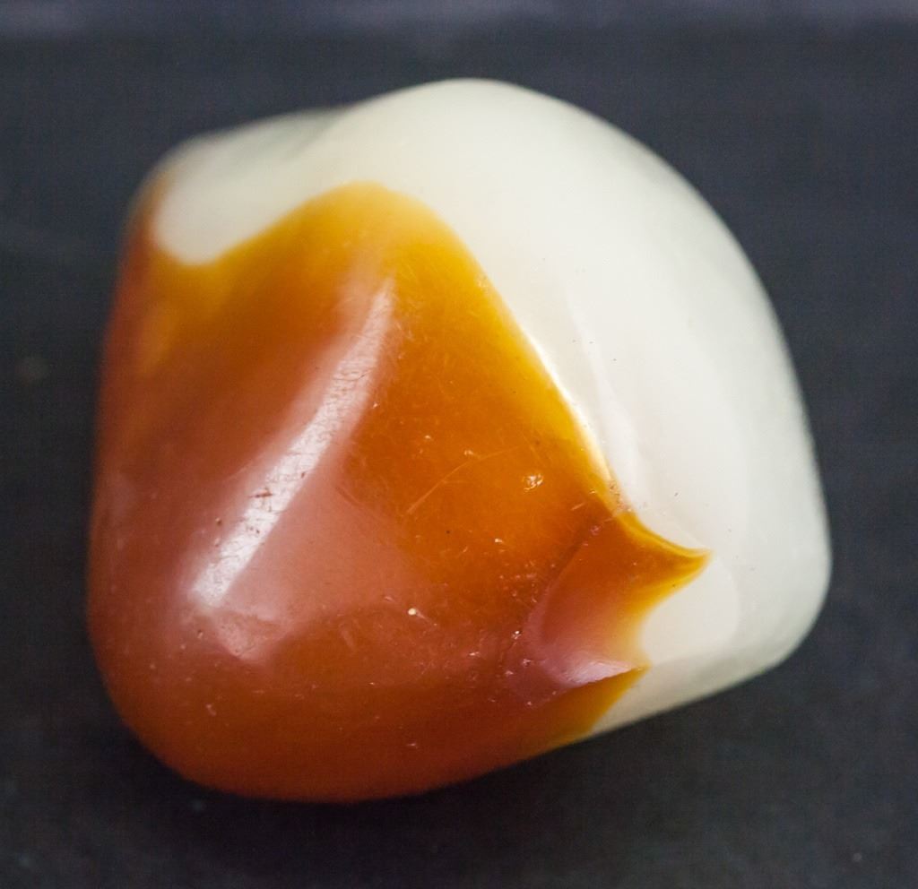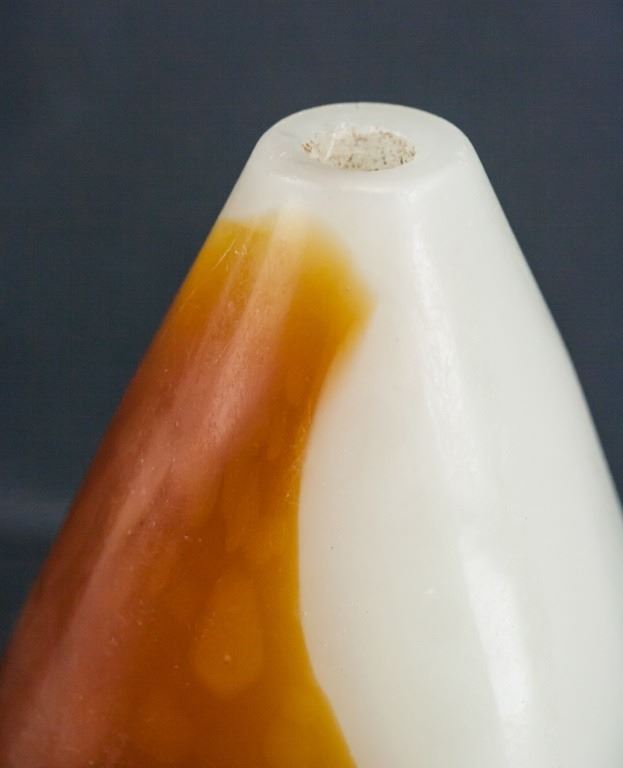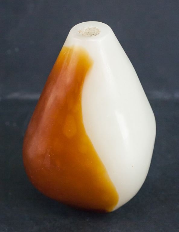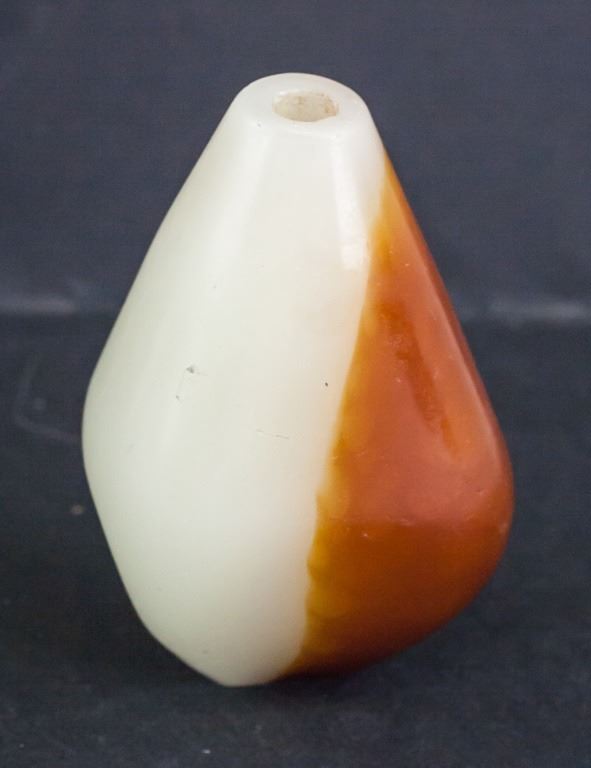 Chinese jade snuff bottle. Of white and brown tone. Of triangular shape, with small round opening. 6 x 4 cm. 40 grams..