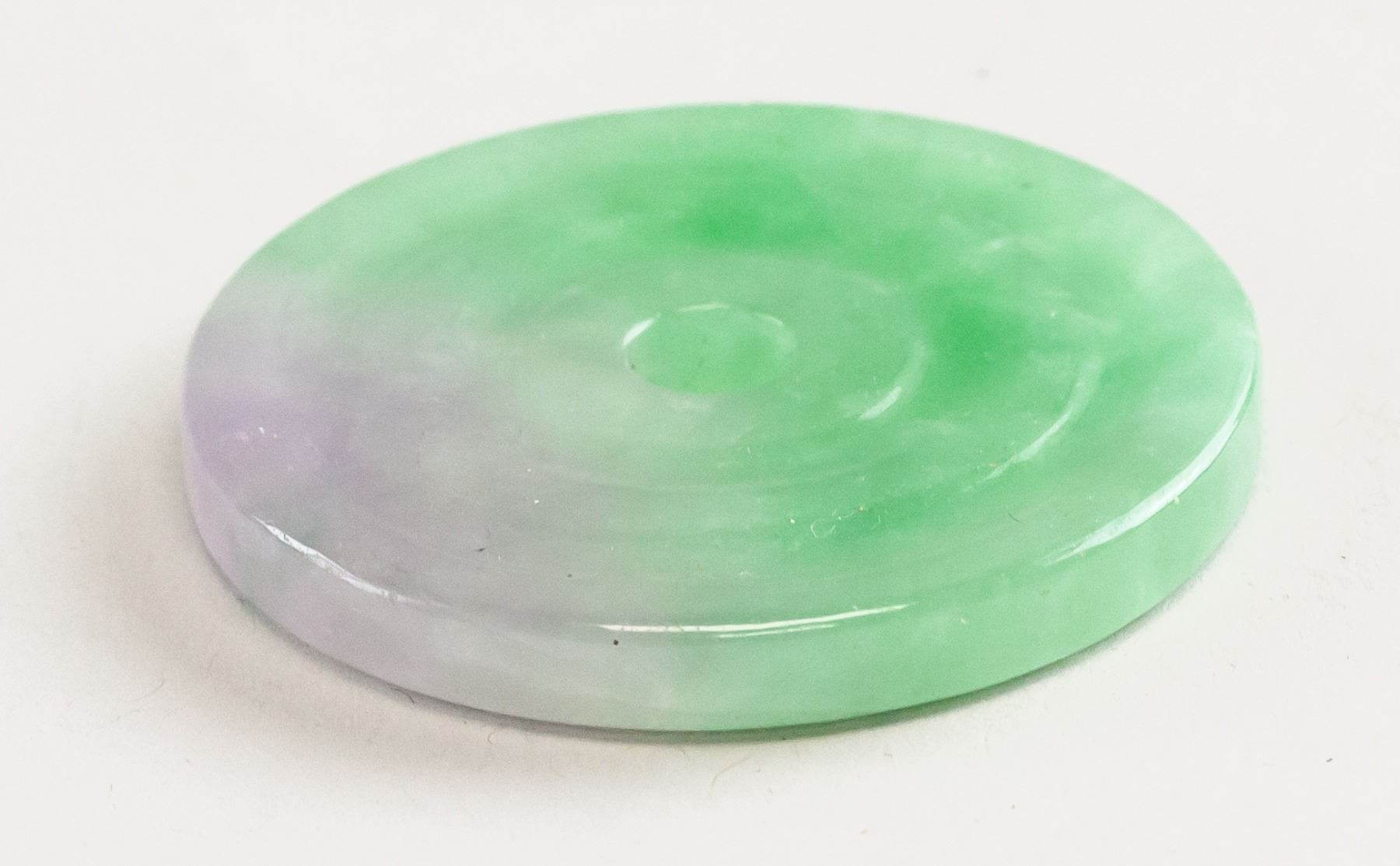 Chinese jade pendant. Of green and lavender tone. Of disc shape, with a hole in the center. Diameter: 6 cm, 36 grams, Density: 3.31