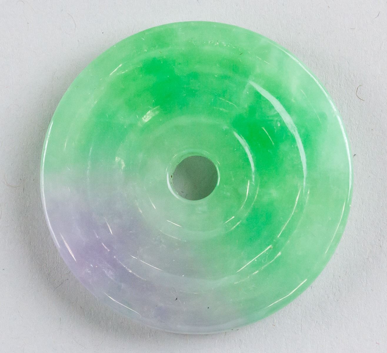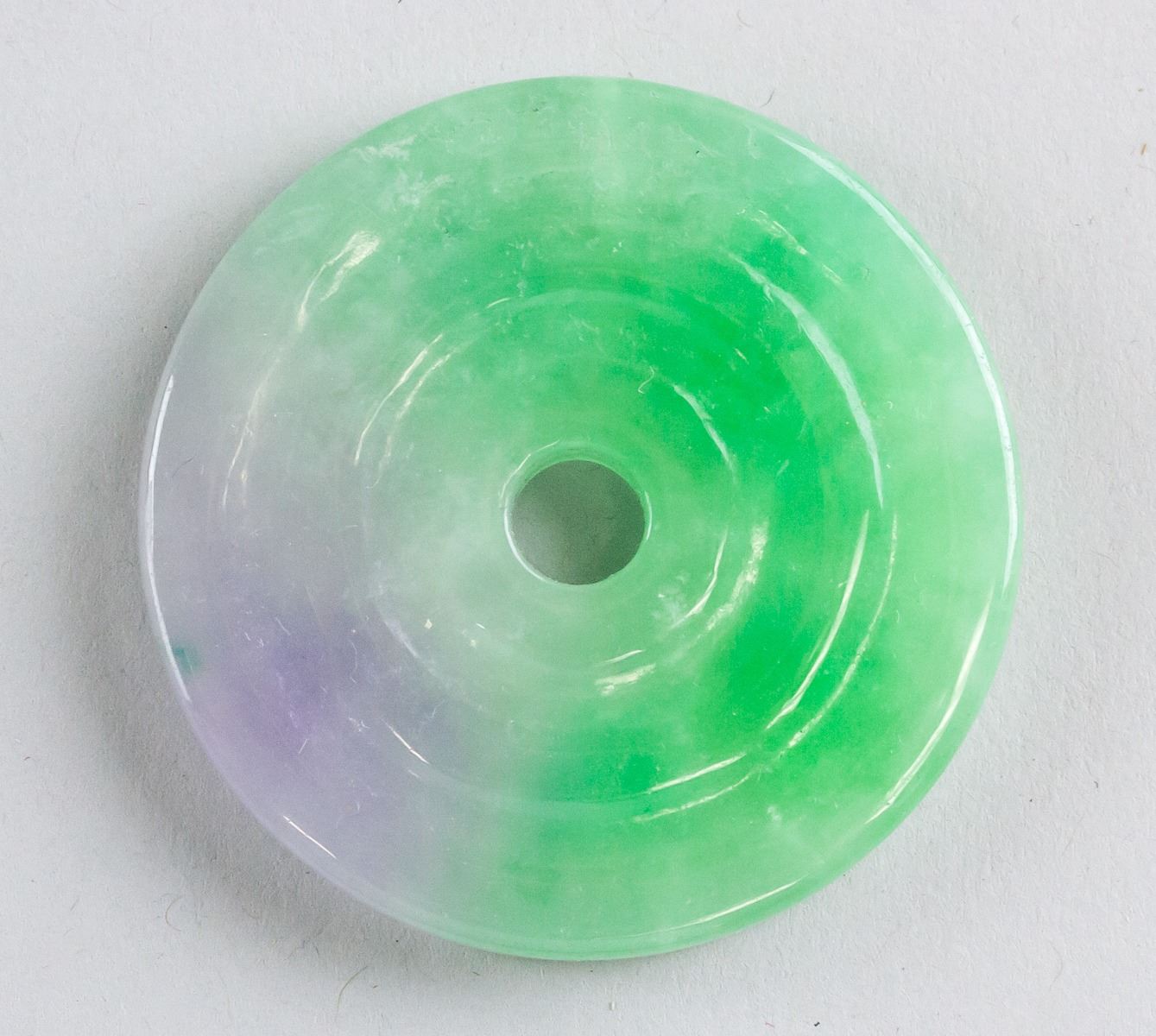 Chinese jade pendant. Of green and lavender tone. Of disc shape, with a hole in the center. Diameter: 6 cm, 36 grams, Density: 3.31