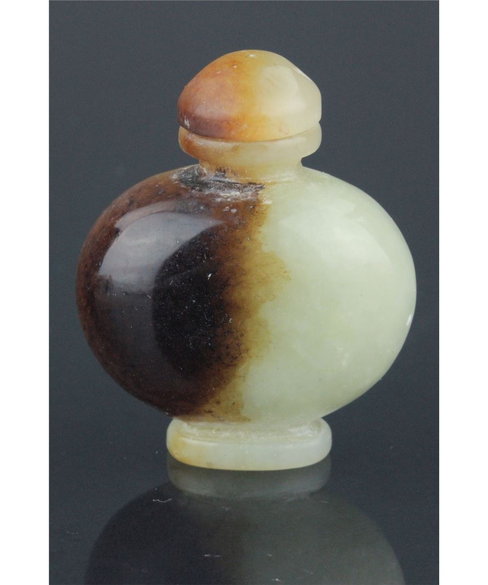 Chinese two colour jade snuff bottle; of oval-shaped body with lid; of white tone with dark brown skin; H: 6 cm, W: 5 cm, 85 grams