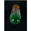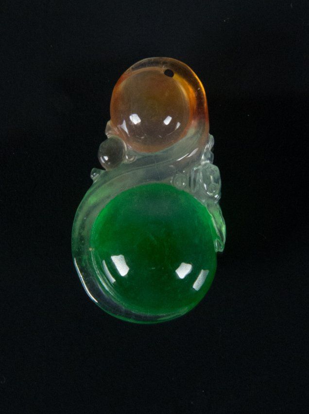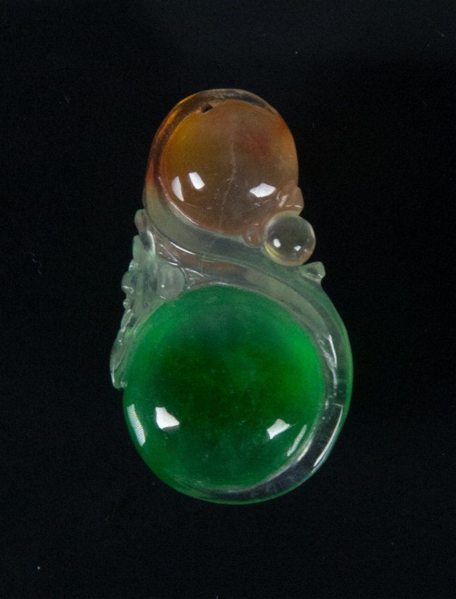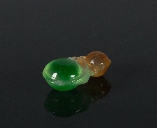 Chinese two-toned jadeite carved pendant; in form of lingzhi fungus and auspicious calabash; of translucent lustrous orange-brown and emerald green tone; pierced for suspension; L: 3.5 cm, W: 1.8 cm, 10 grams