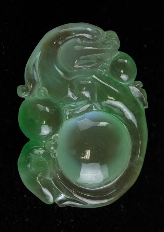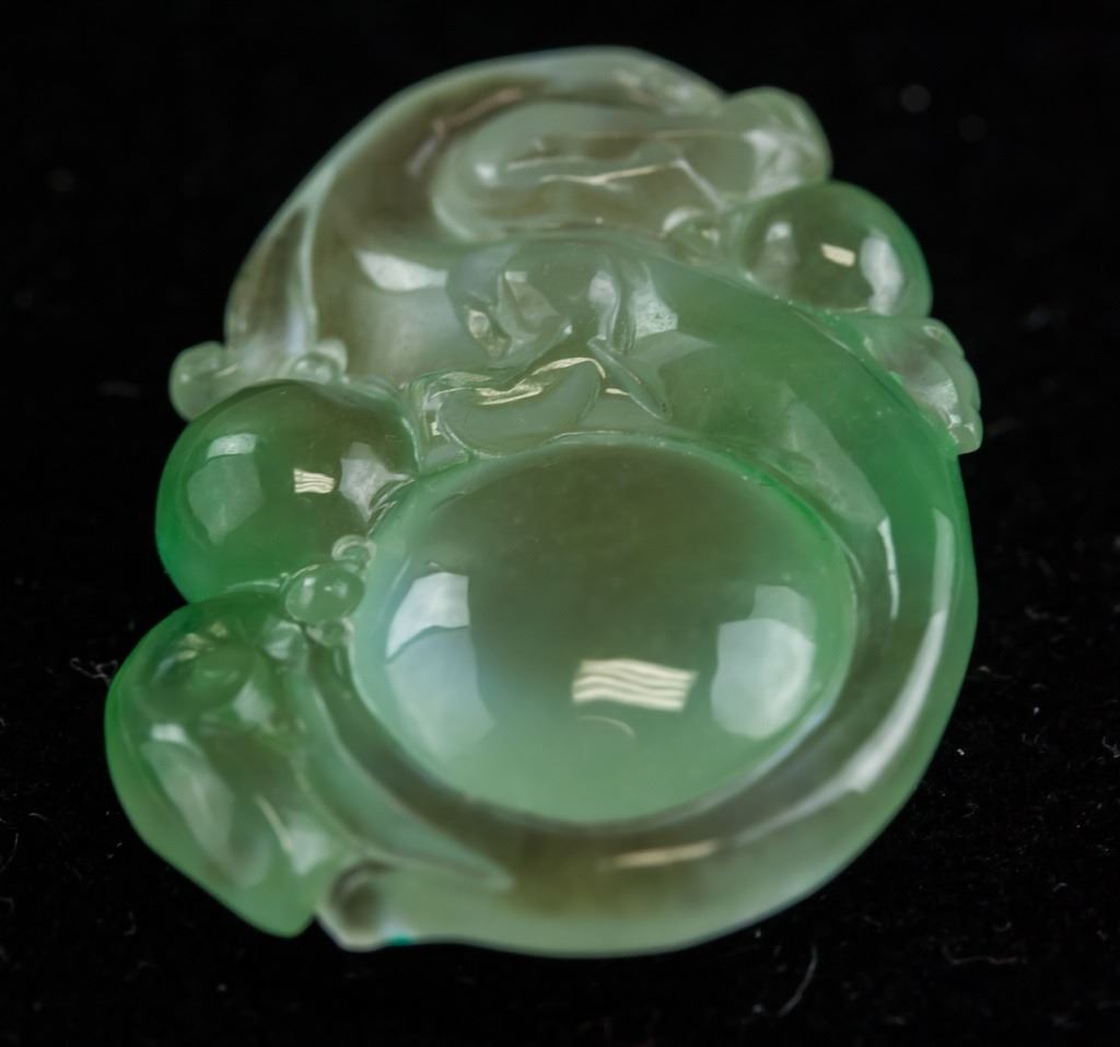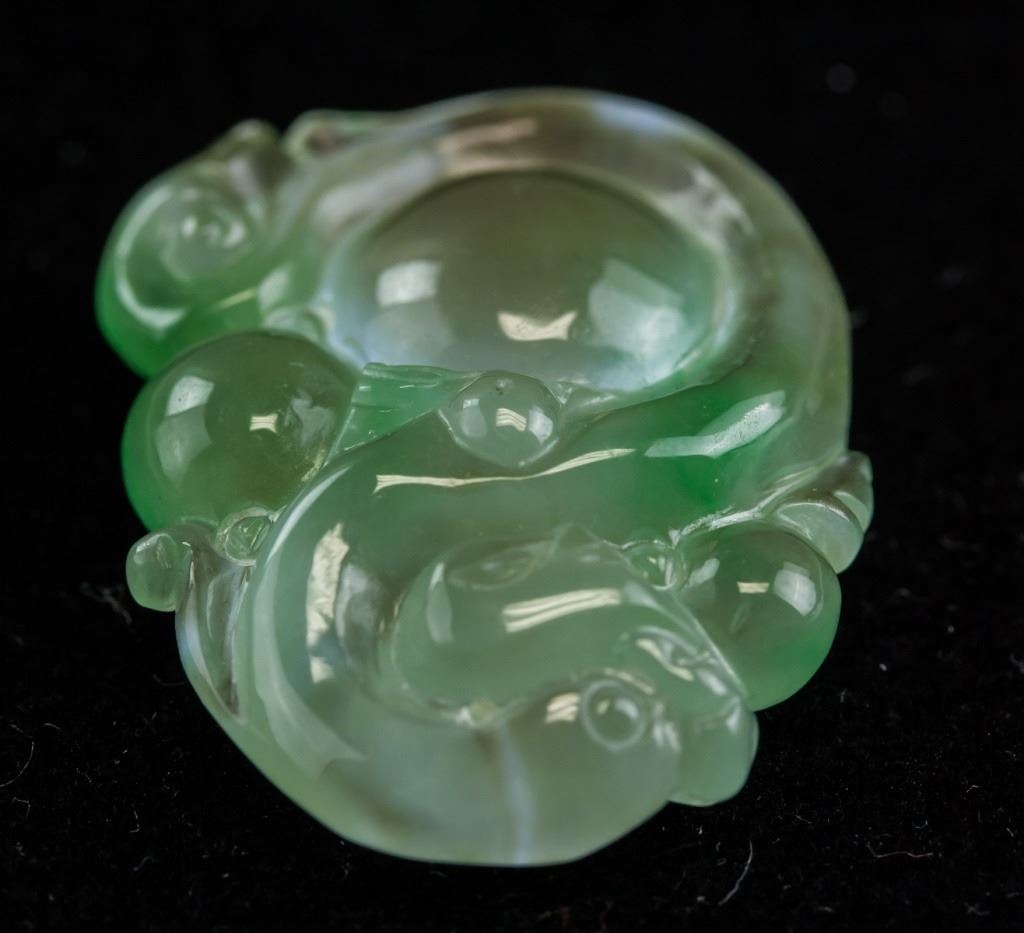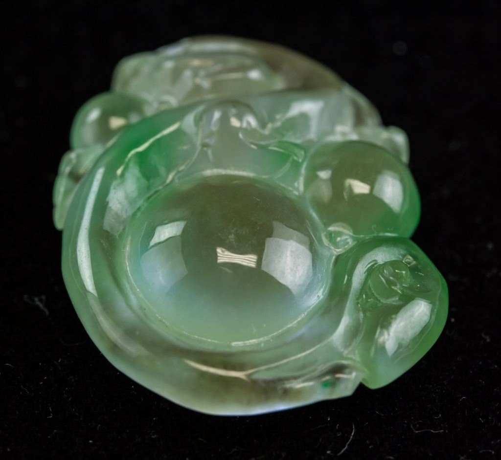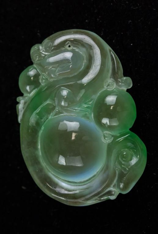 Chinese carved pendant featuring lingzhi fungus in relief. Of translucent white and green two-tone. 4 x 2 cm. 16 grams