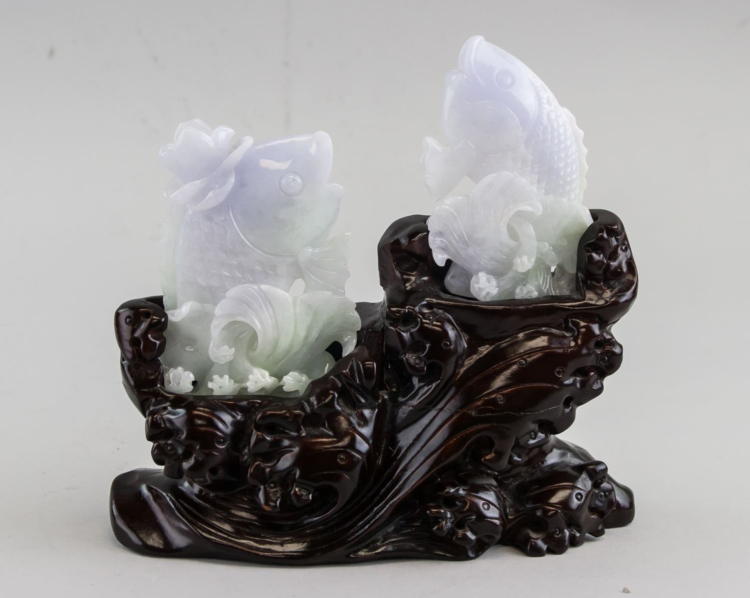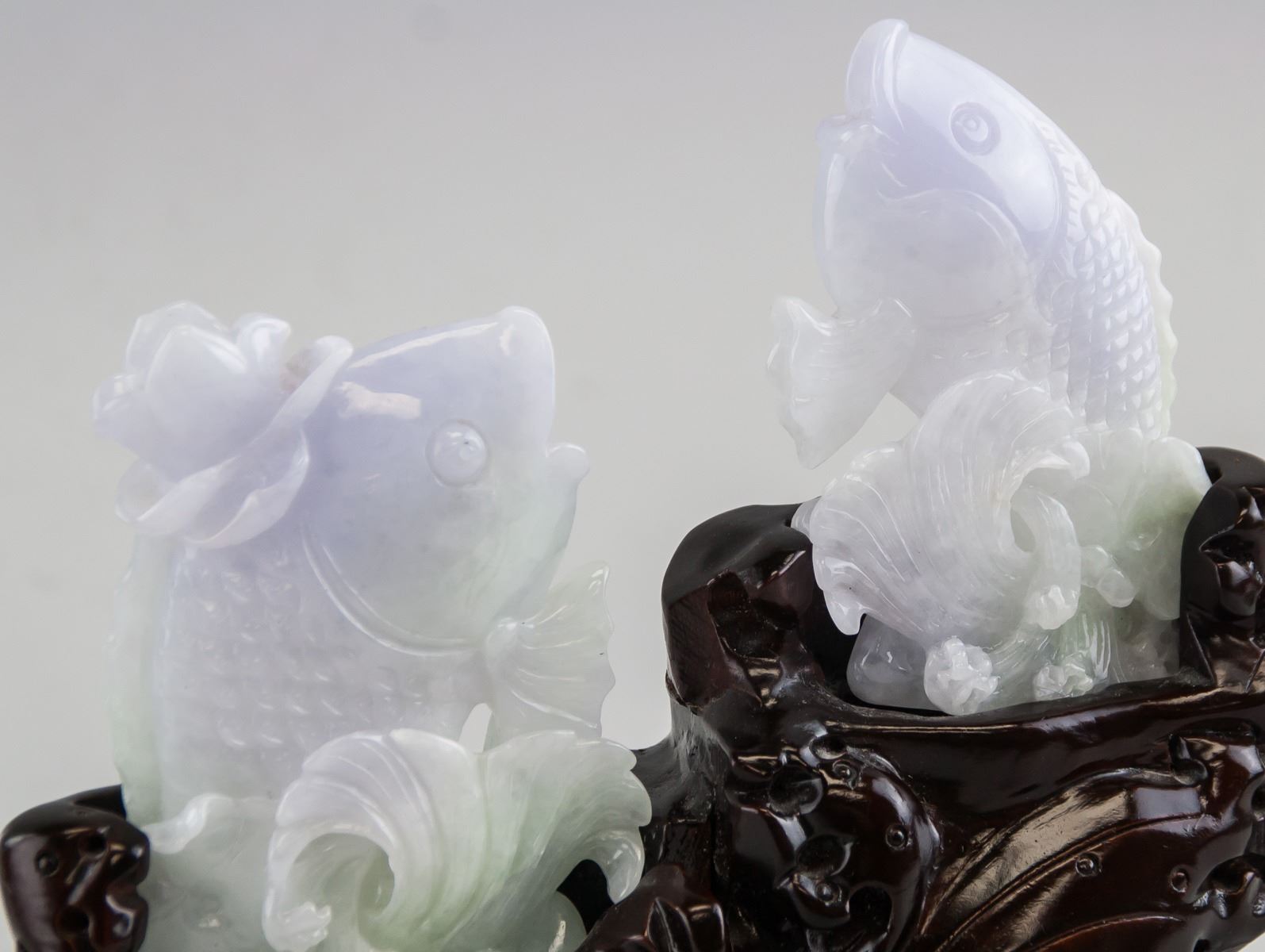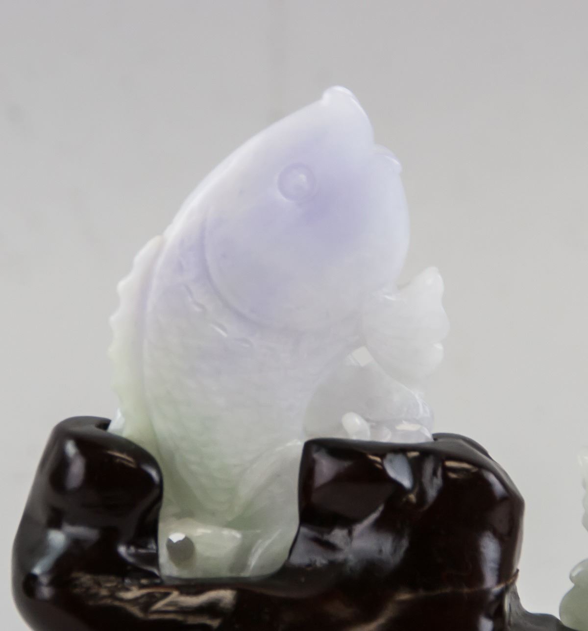 Two (2) Chinese jadeite fish plaques. Of lavender tone with green tinge. Supported by carved wooden stand. 9 x 7 cm, 718 grams w/stand. Density: 3.30 and 3.30
