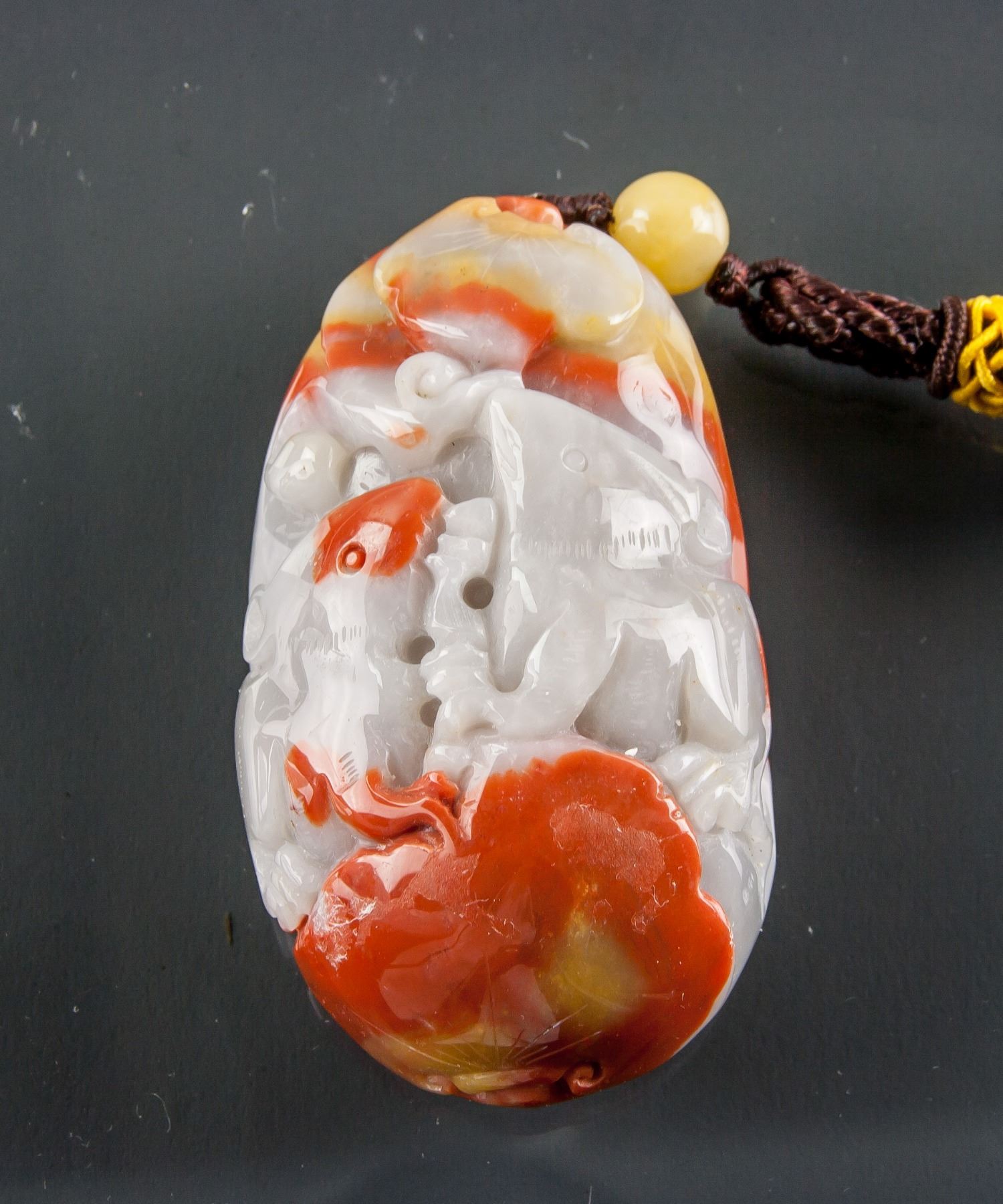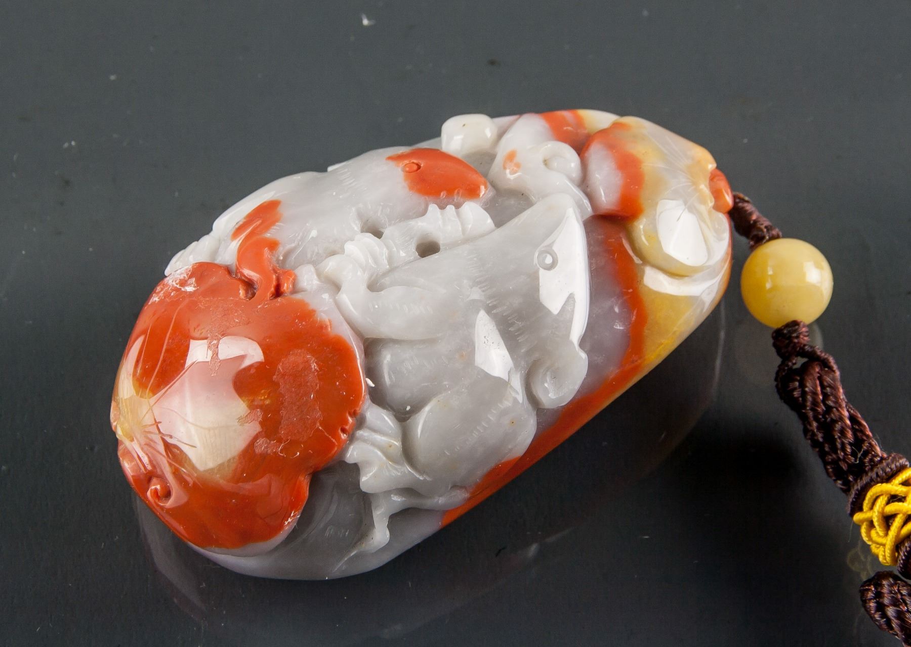Chinese jade pebble, of translucent lavender with orange and yellow suffusions, featuring pair of auspicious fu mouse with ruyi. Suspending onto brown hanging string with yellow bead. H: 7 cm, W: 4 cm, 130 grams. Provenance: T. Ng Collection Toronto.