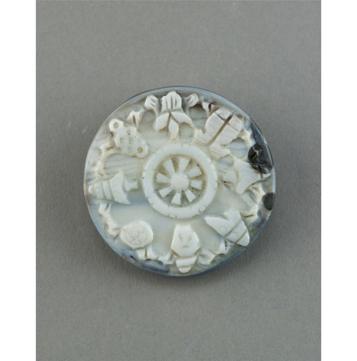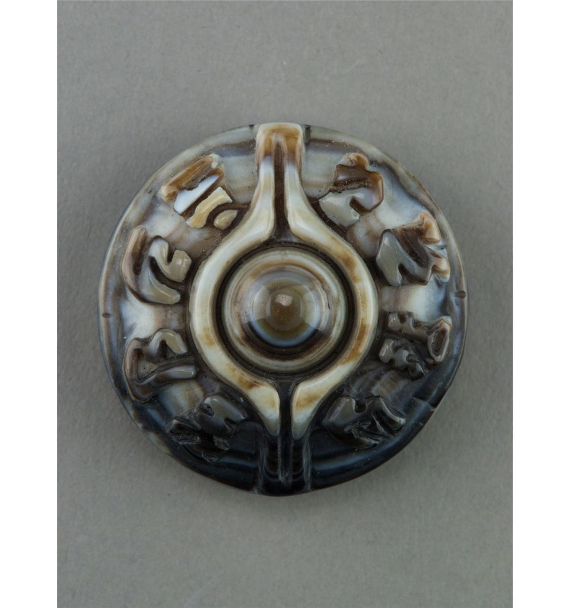 Chinese two tone hardstone pendant, of circular form, featuring archaic carvings. D: 5 cm, 58 grams.