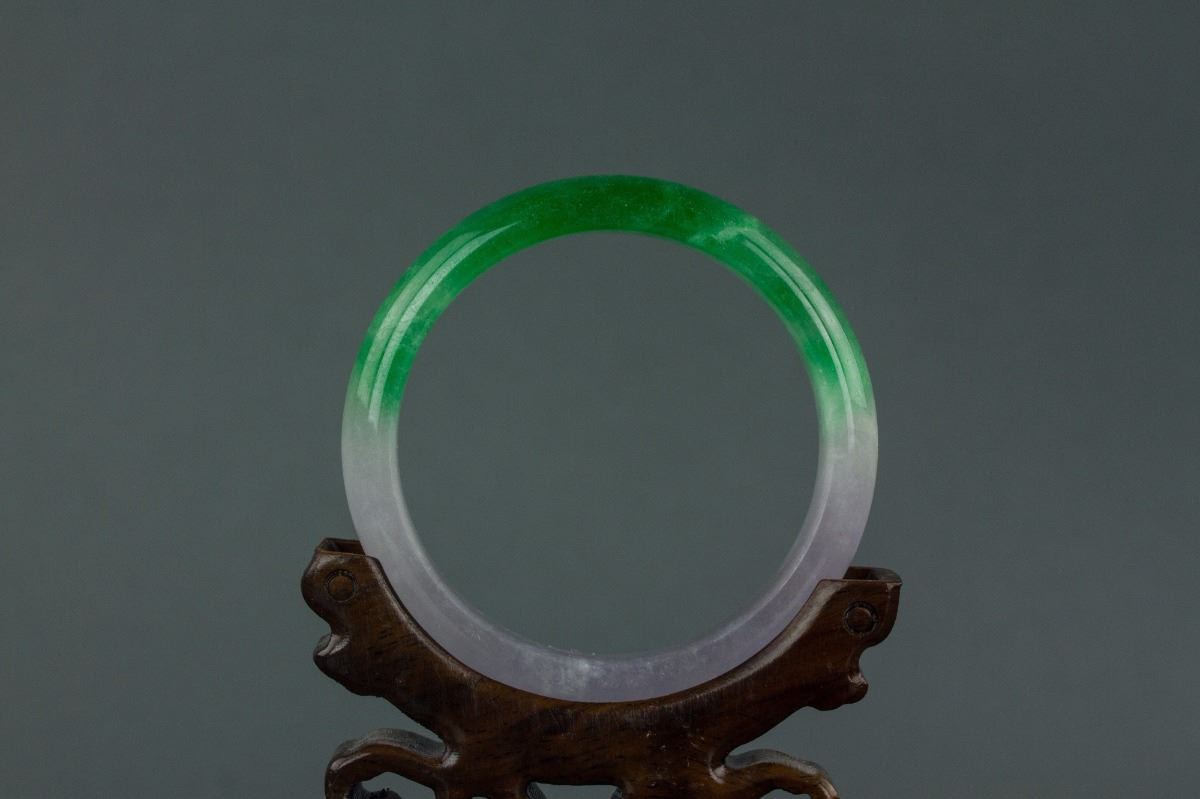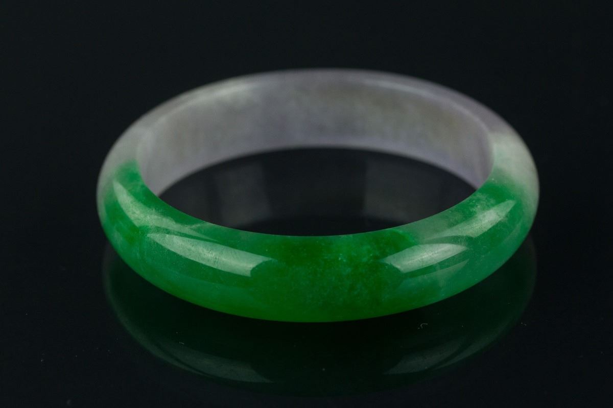 Chinese two-toned jade bangle; rounded outside and flatten inside; the stone of translucent emerald green and lavender tone; H: 1.2 cm, D: 6.8 cm, Inner D: 5.6 cm, 51 grams, Density: 3.30