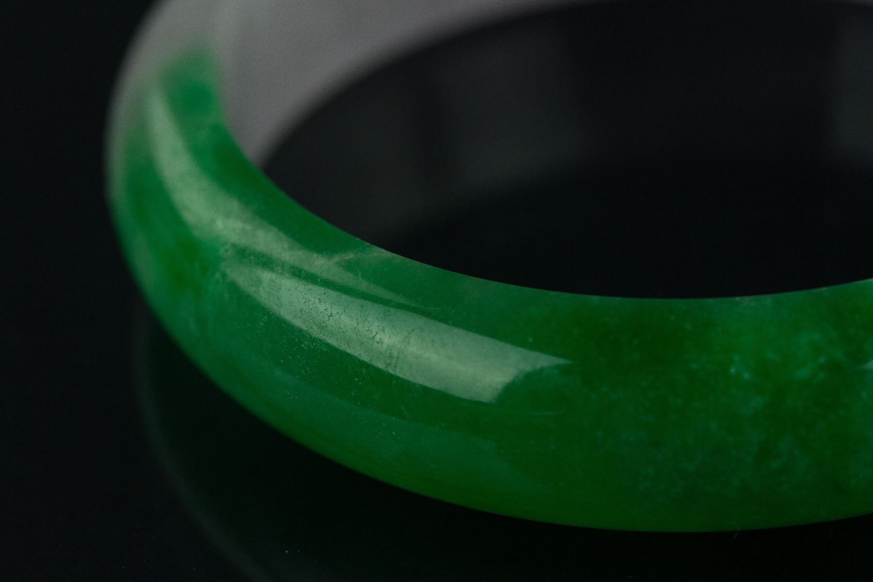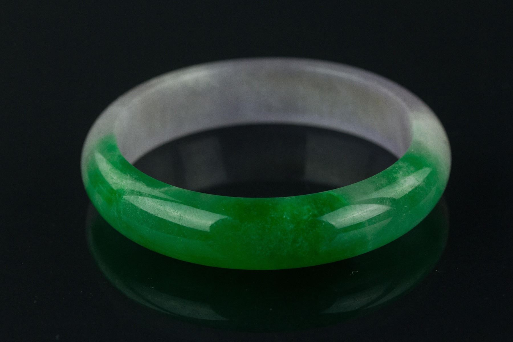 Chinese two-toned jade bangle; rounded outside and flatten inside; the stone of translucent emerald green and lavender tone; H: 1.2 cm, D: 6.8 cm, Inner D: 5.6 cm, 51 grams, Density: 3.30