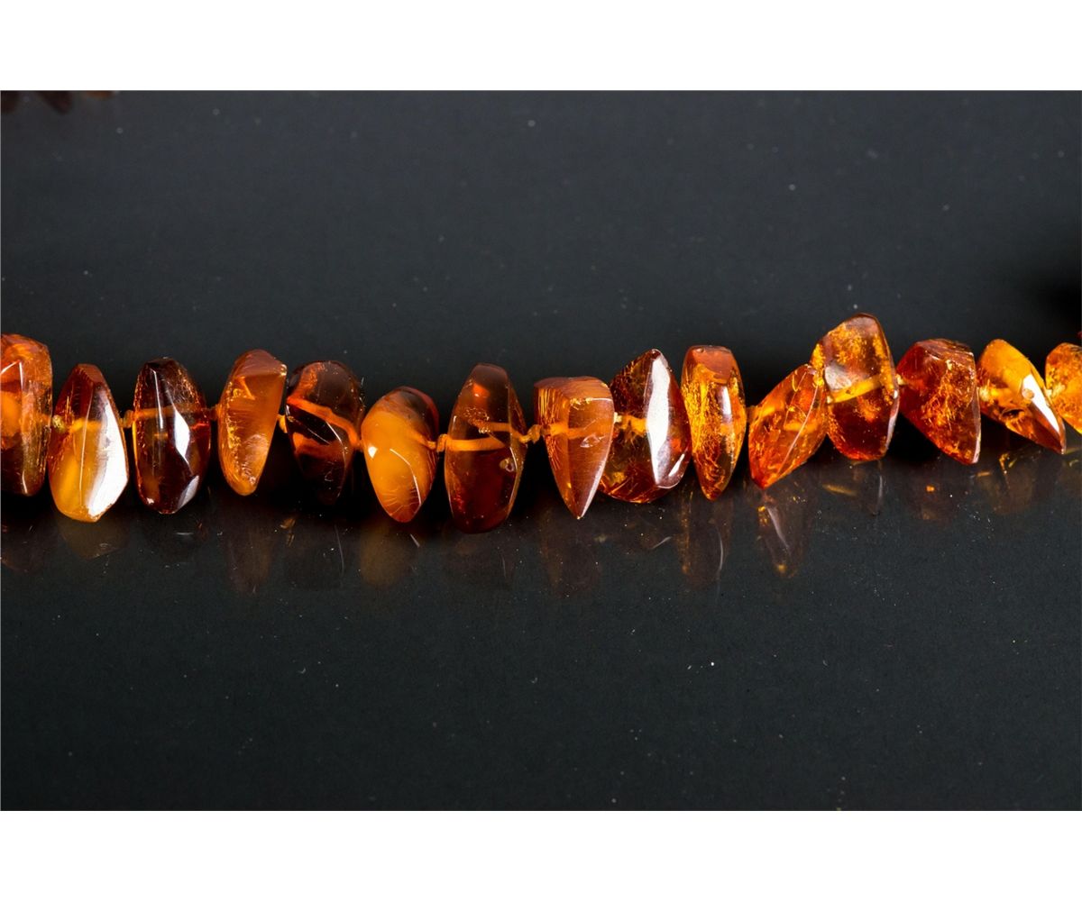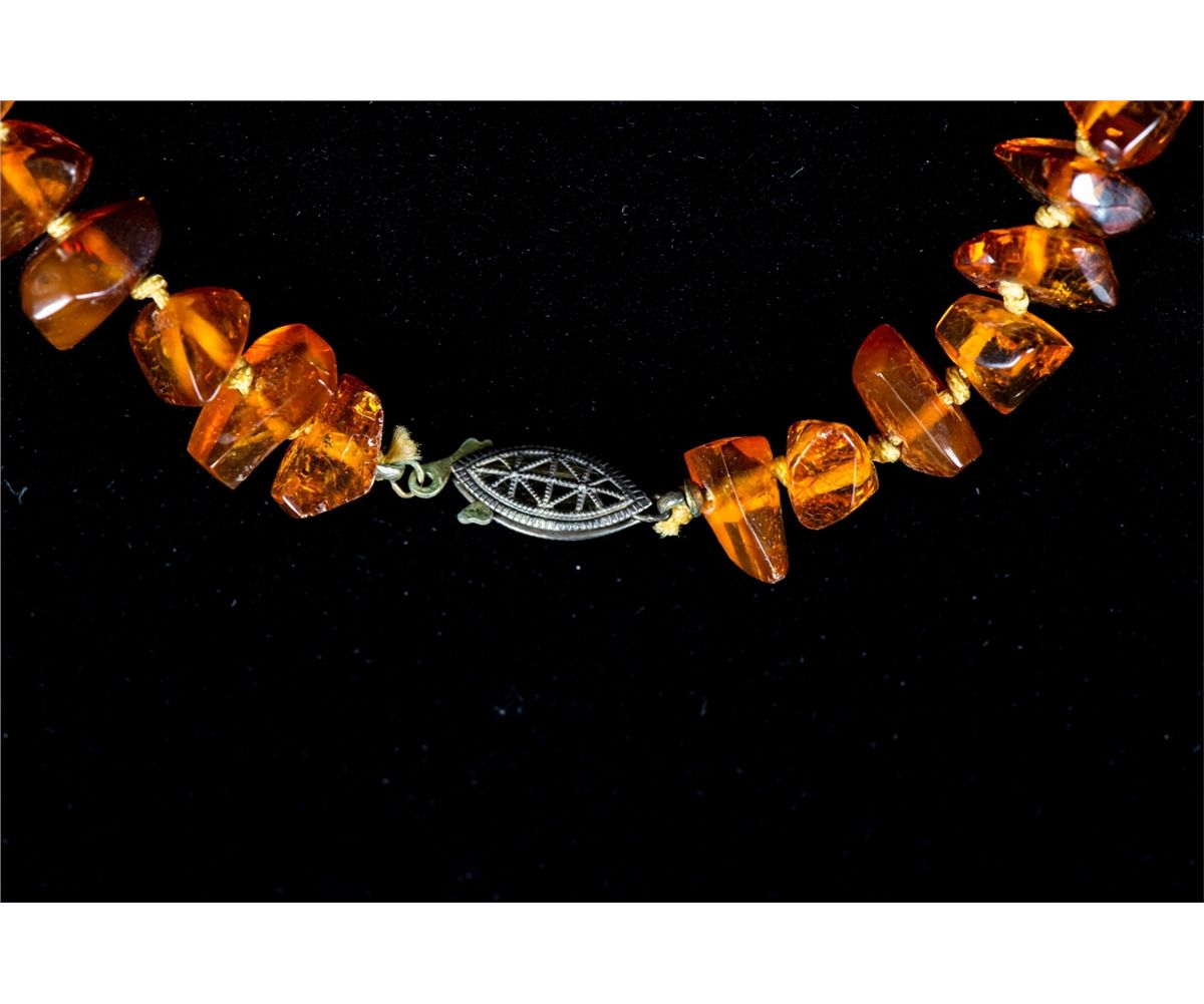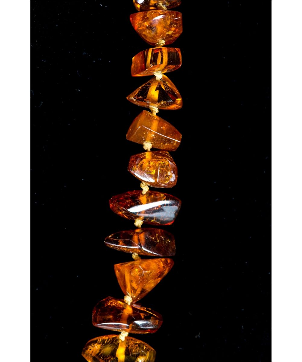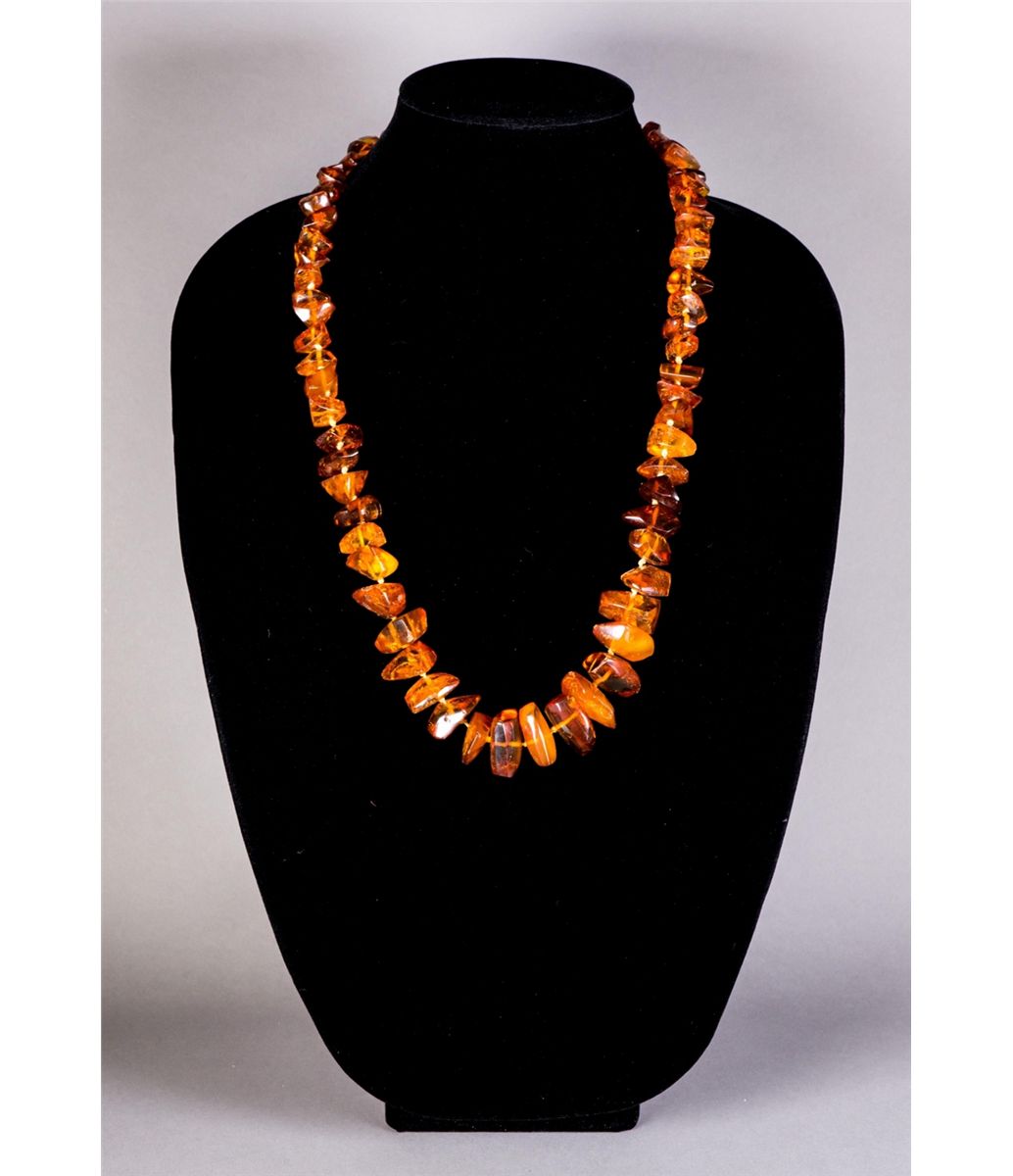 Chinese uncarved amber necklace; comprised of free-form polished amber beads; of deep honey yellow tone; D: 25 cm, 80 grams
