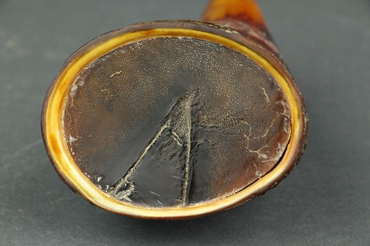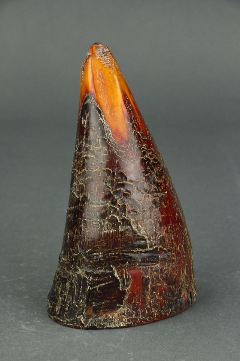 Chinese uncarved horn; of mahogany tone; with natural horn grain; H: 12 cm, W: 8 cm, 246 grams