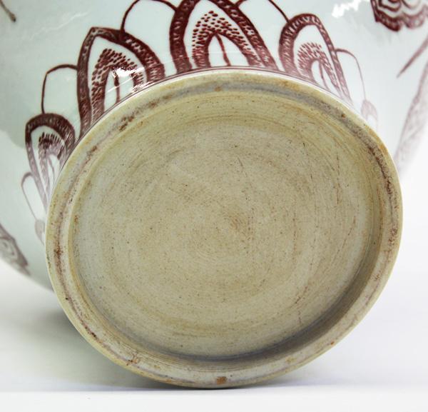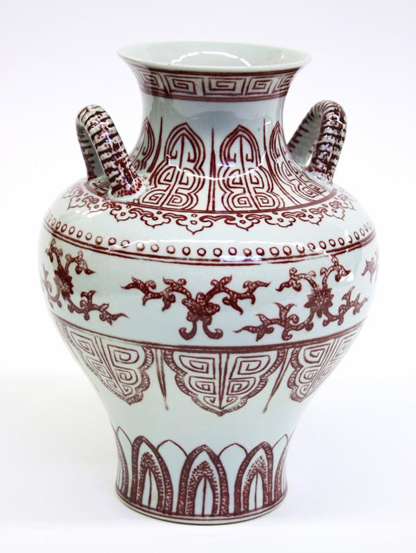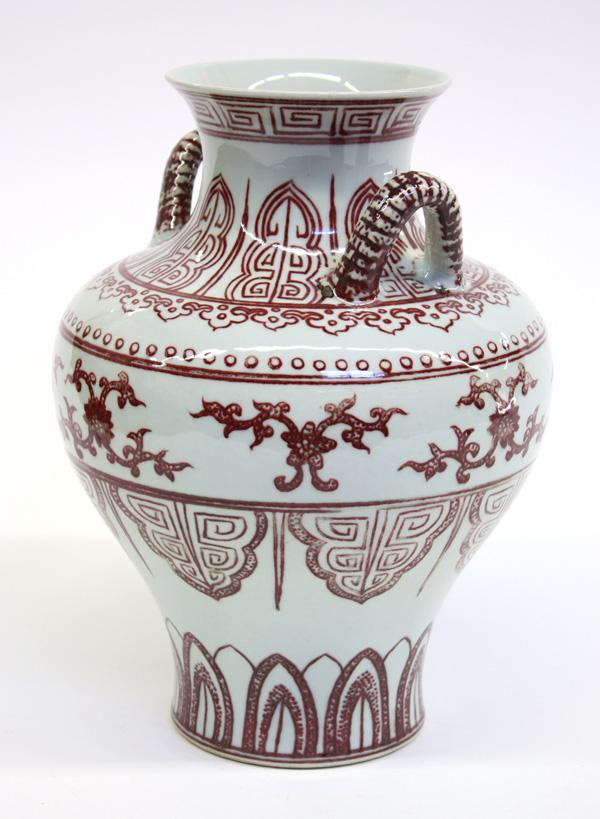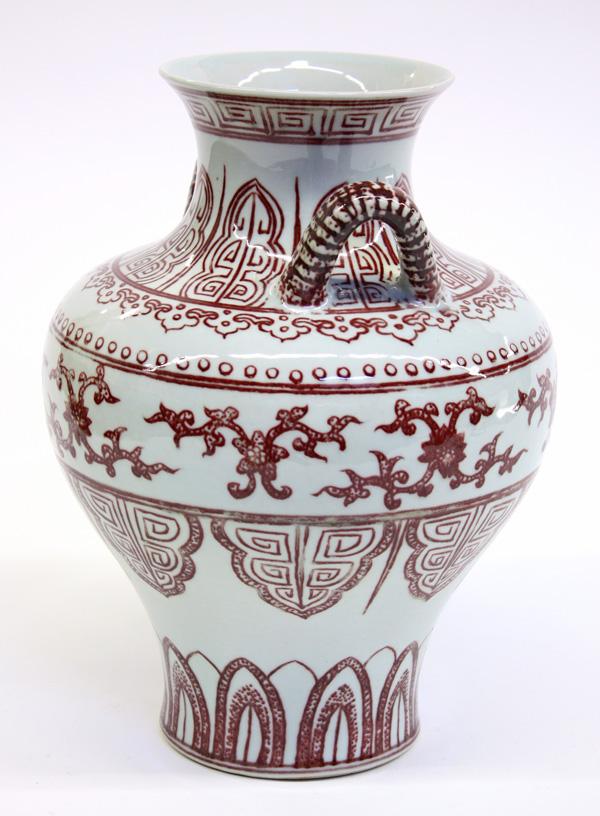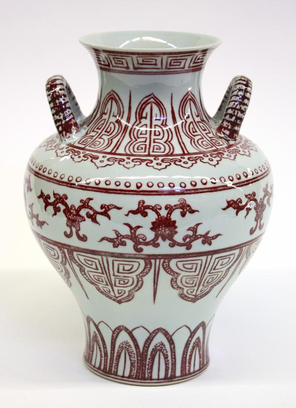 Chinese underglazed red decorated porcelain vase, with loop handles bracketing the stiff leaf decorated neck and a ruyi band on the high shoulders, the tapering body accented with stylized lotus sprigs and a cicada form motif above overlapping lappets to the slightly splayed foot (hairline crack), 11.75''h