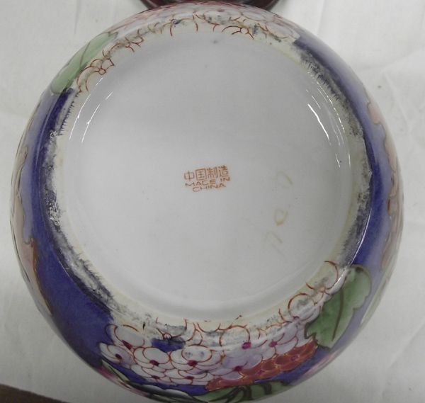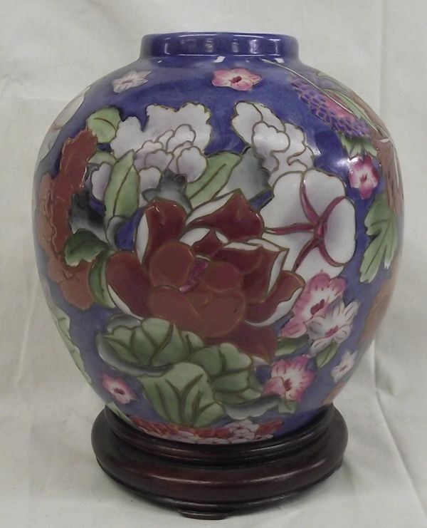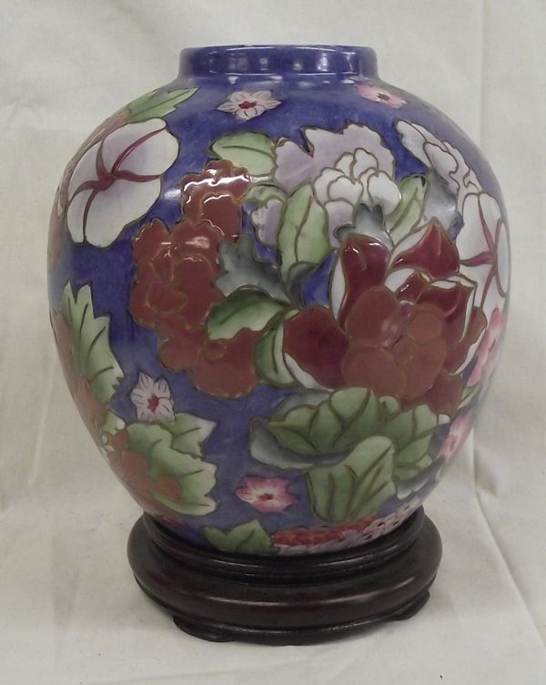 Chinese Vase With Carved Stand. Large floral motif surround this traditional shaped Oriental vase. Measures 8'' x 8'', includes carved rosewood stand.