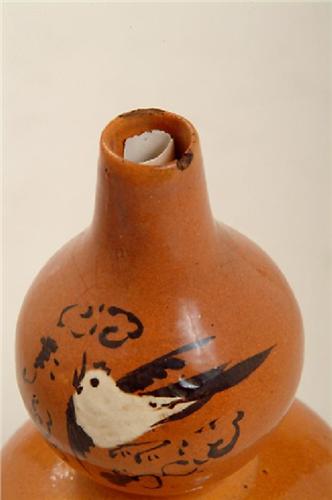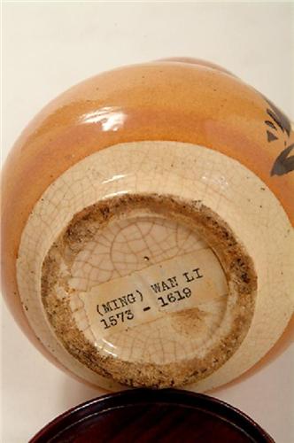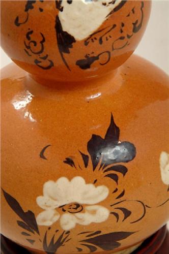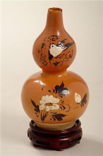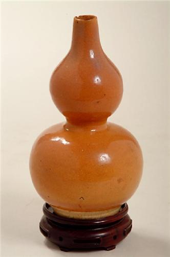 Dated (Ming) Wan Li 1573-1619, . Gourd vase with a tapered spout. Scene only on one side. Chips in spout and white glaze at base, otherwise in good condition. Set on a wooden base with three legs, 1 1/8” by 3 ½”, Vase is 7 ¼” by 4” in diameter