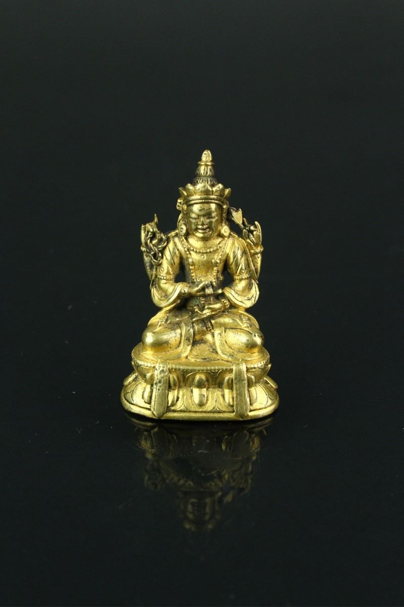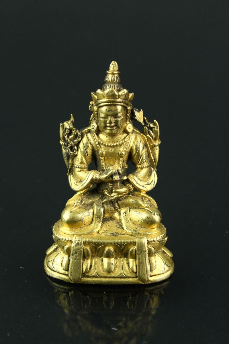 Chinese fine small gilt bronze figure; Ming period; depicting Four-armed Tibetan form of Avalokitesvara on lotus plinth; H: 3 cm, W: 2.5 cm, 59 grams with case