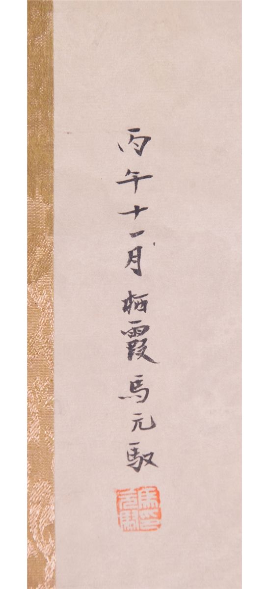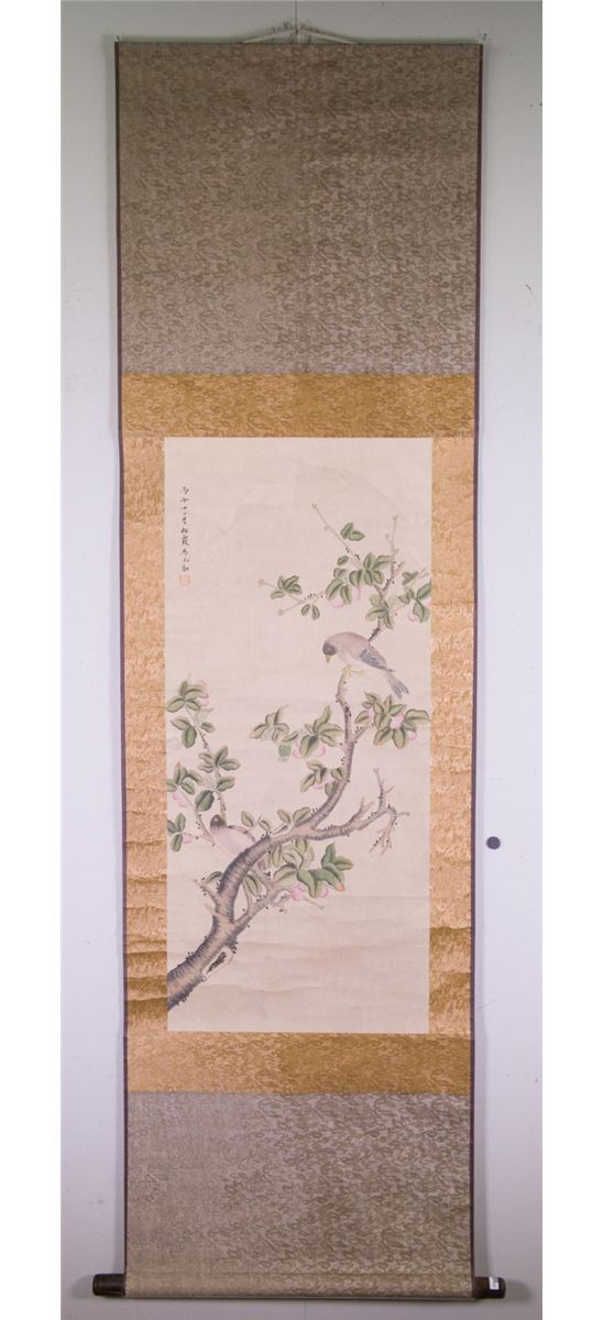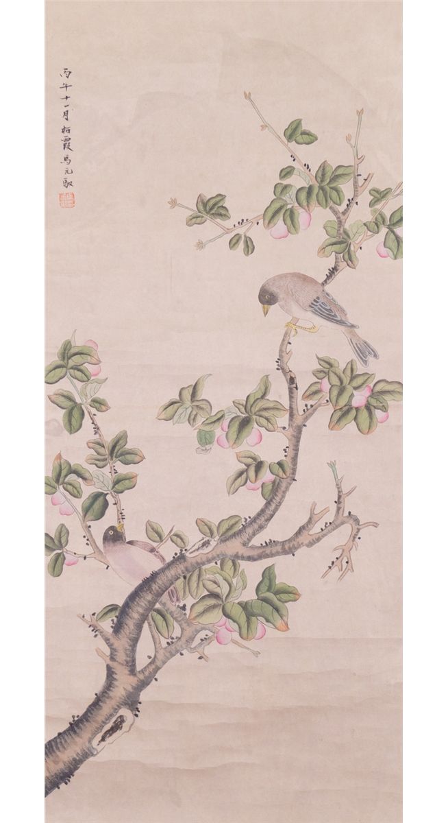 Birds standing on peach branch; Chinese ink and watercolour on paper; hanging scroll; signed Ma Yuanyu (1669-1722) and inscribed with one artist seal; 91 cm x 40 cm