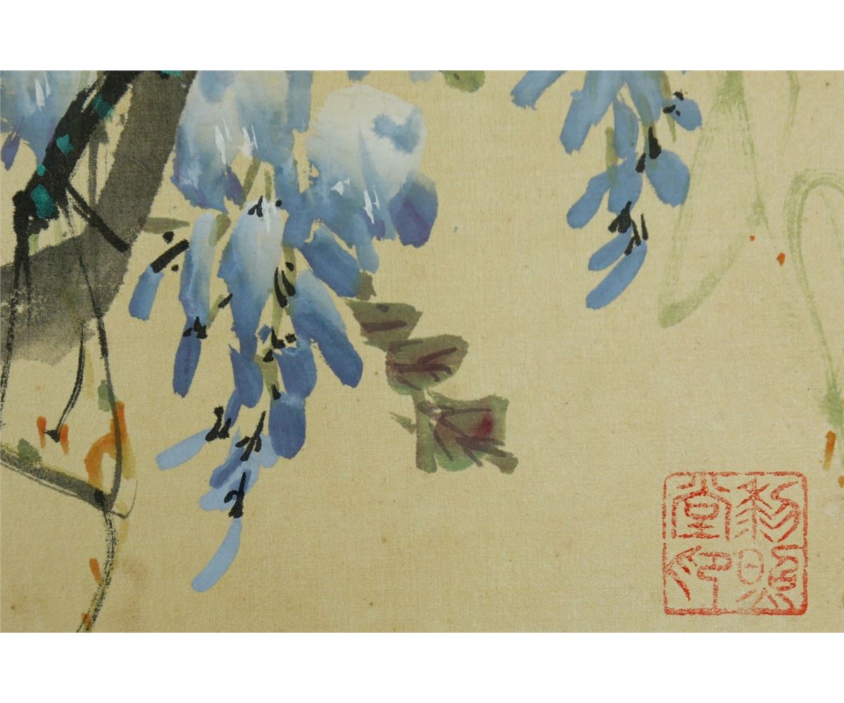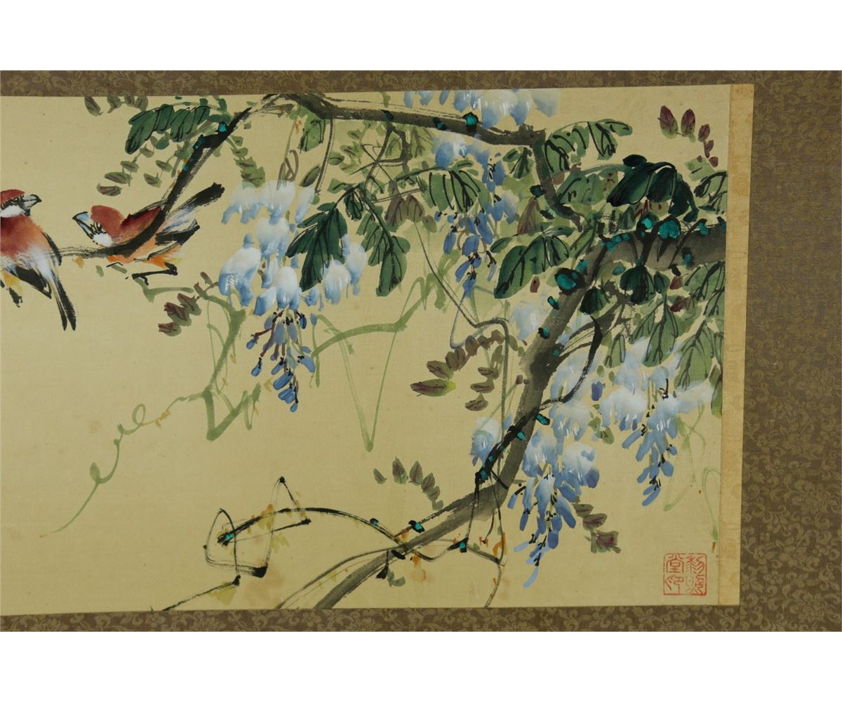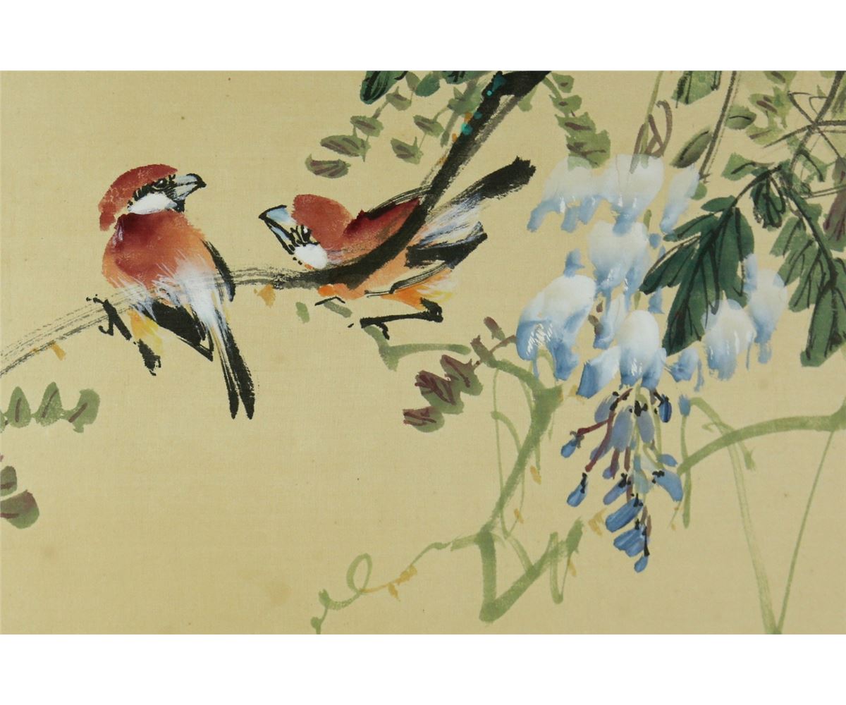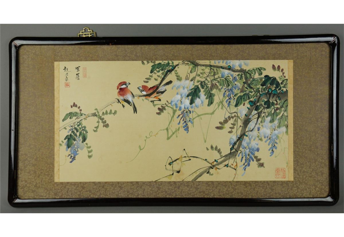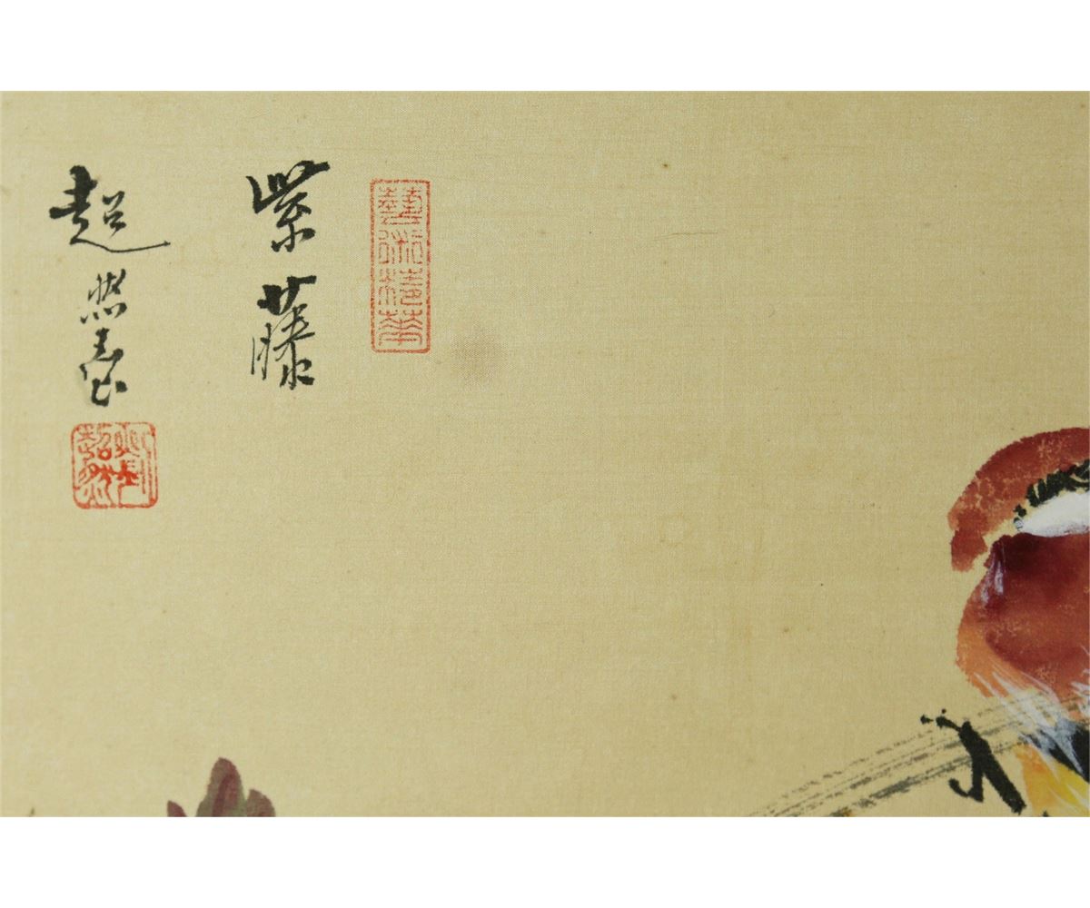Songbirds standing on grape vines; Chinese ink and watercolour on paper; framed; signed Zhao Chaoran and inscribed with three artist seals; 47 cm x 92 cm w/ frame