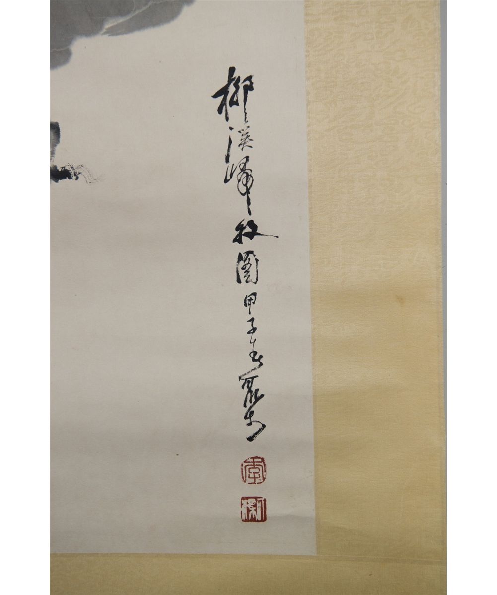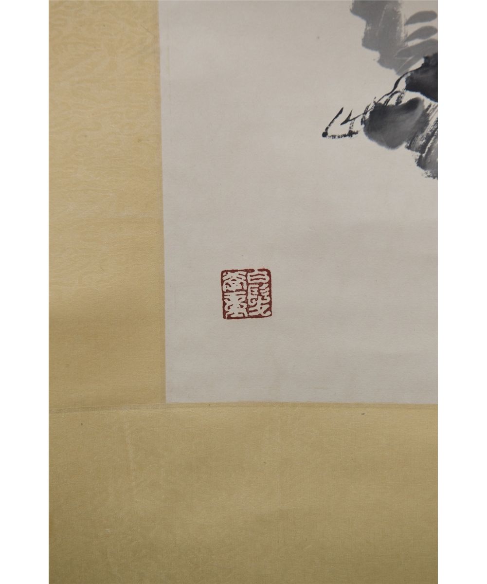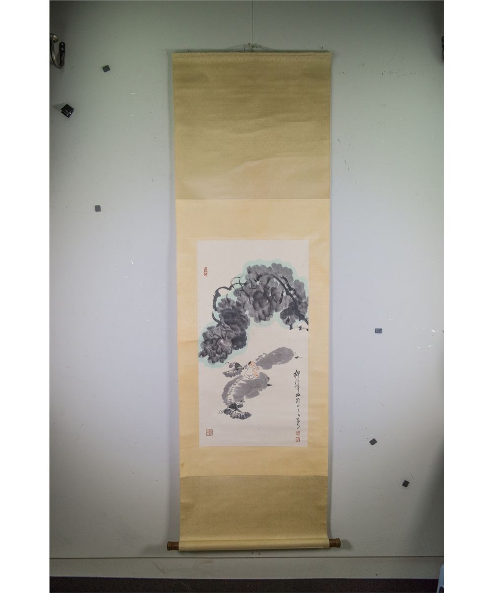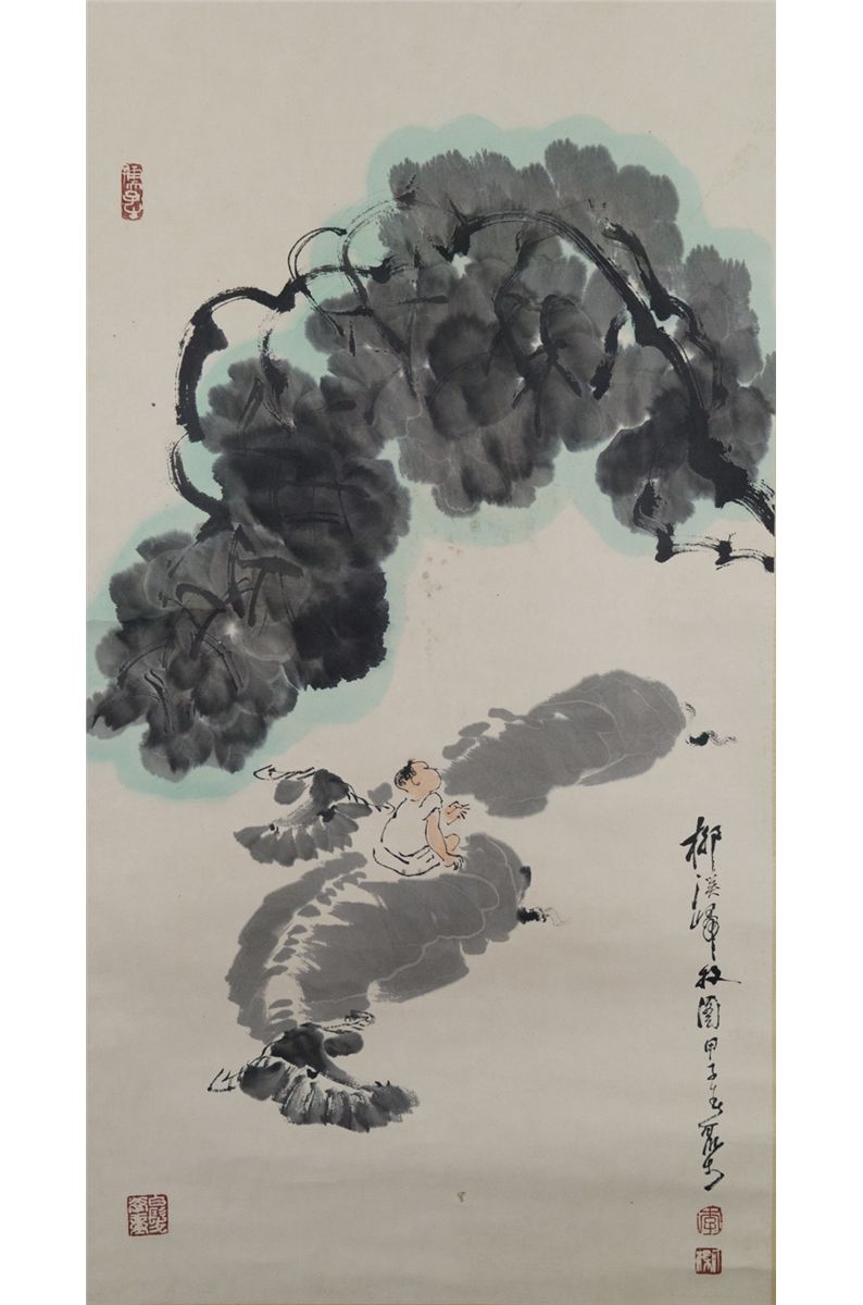 A boy on a buffalo resting under a tree; Chinese ink and watercolour on paper; signed Li Keran (1907-1989) and inscribed with four artist seals; 92 cm x 48 cm