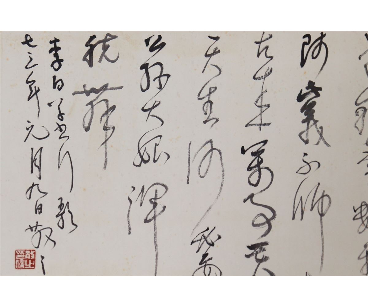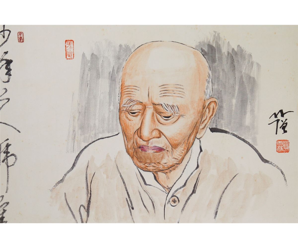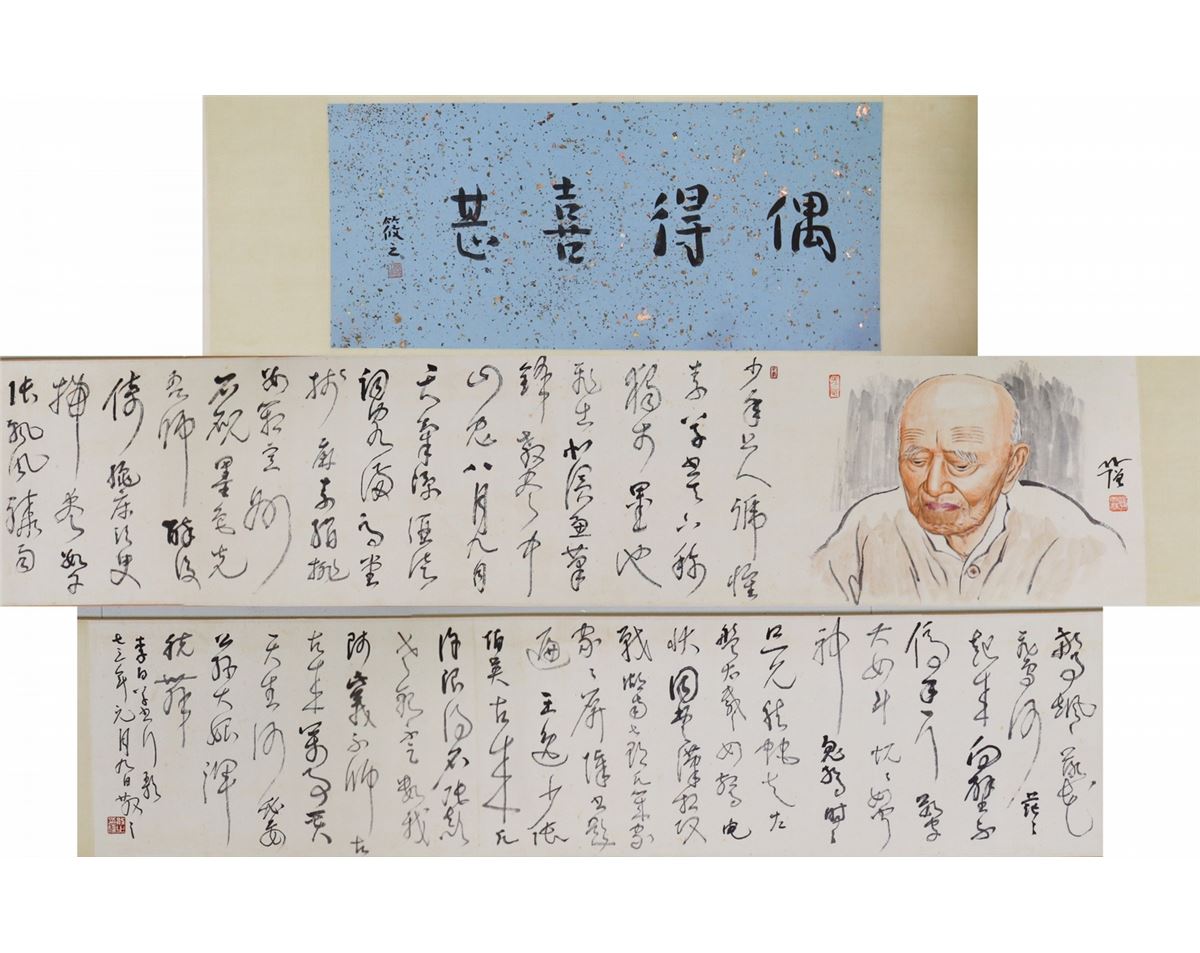 Portrait of an old man and cursive script calligraphy; Chinese ink and watercolour on paper; hand scroll; signed Lin Sanzhi and inscribed with three artist seals; 32.5 cm x 274 cm, 30 cm x 66.5 cm