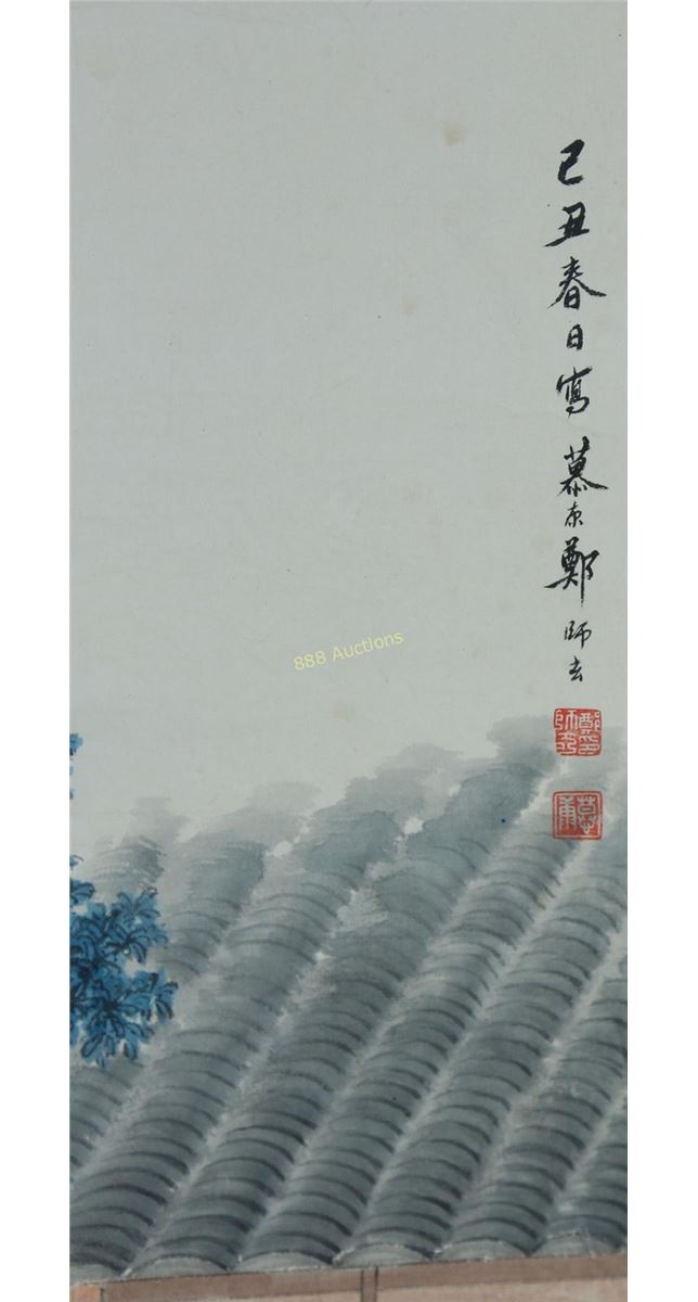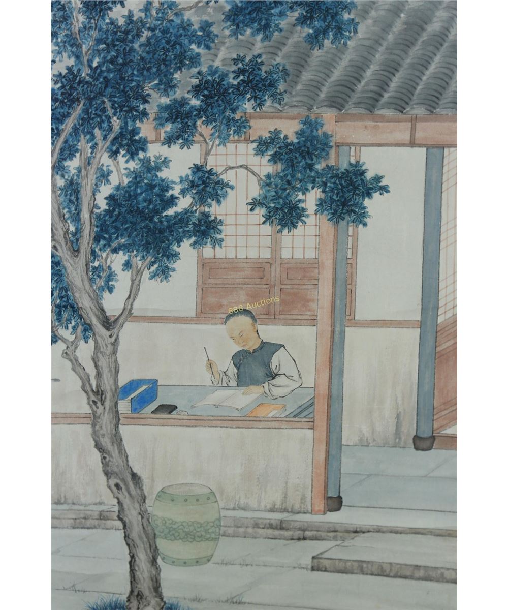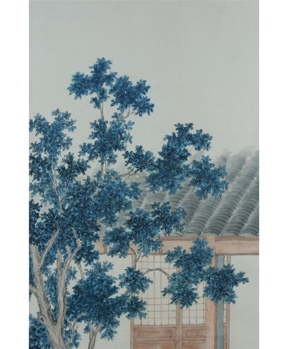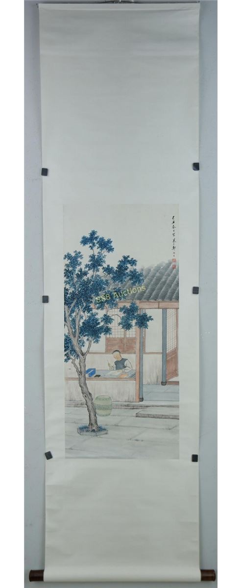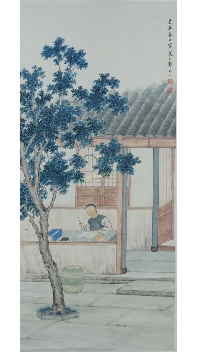 Man studying at courtyard; Chinese ink and watercolour on paper; hanging scroll; signed Zhen Mukang and inscribed with two artist seals; 87 cm x 39 cm